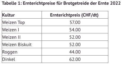 Fr. 8.-/dt Brotgetreide hatte der Schweizerische Getreideproduzentenverband (SGPV) gefordert. In der Branchenorganisation Swiss Granum kam ein Kompromiss zwischen Produzenten und Verarbeitern zustande, wie es in einer Mitteilung heisst: je nach Kultur steigen die Richtpreise für Brotgetreide um Fr. 3.- bis 5.-/dt.