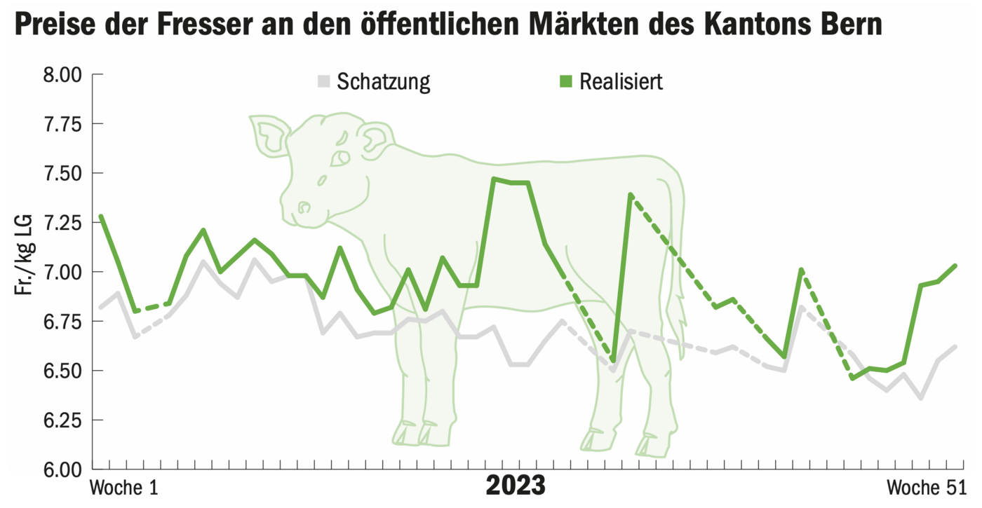 Tränker, die jetzt zu Tiefstpreisen verkauft werden müssen, wären in rund einem halben Jahr als Fresser sehr gefragt. Wer also Platz hat, seine Kälber mindestens 161 Tage auf dem Betrieb zu behalten und sie an Raufutter zu gewöhnen, der findet dann eine deutlich bessere Nachfrage. Geeignet sind insbesondere SF-Kälber beider Geschlechter. Für schöne Tiere der Kategorie JB werden auf den öffentlichen Märkten regelmässig deutliche Übersteigerungen erzielt, die Nachfrage ist gerade im Herbst sehr gut. Für fleischige Fresser werden rund 1800 Franken bezahlt. Benötigt werden bis dann rund 1500 Liter Milch und gutes Raufutter. Wichtig ist, dass die Tiere beim Verkauf gut fressen, und zwar nicht nur Heu, sondern auch Maiswürfel oder Silage.