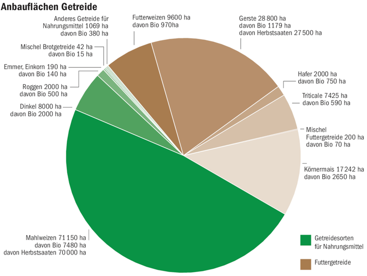 In ihrer Ernteprognose geht die Schweizerische Branchenorganisation Getreide, Ölsaaten und Eiweisspflanzen, Swiss Granum, davon aus, dass in diesem Jahr mehr Getreide angebaut wird. Diese Schätzungen machen Swiss Granum und Agristat aufgrund der Saatgutverkäufe, Feldbesichtigungen und den Wetterbedingungen. Ein Grund für die höhere Getreidefläche dürften die verschärften Fütterungsvorschriften für die Bioproduzenten sein.