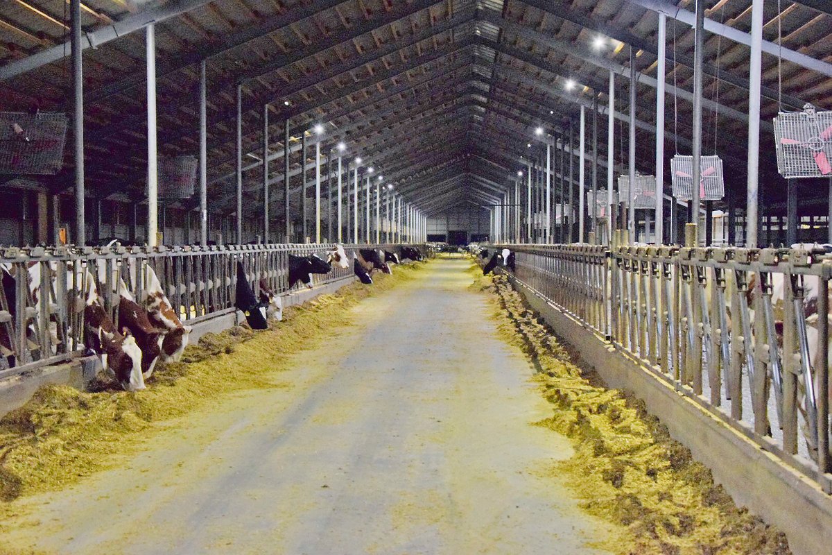 Während sich das Melkkarussell weiterdreht, begleitet der Ekoniva-Geschäftsführer die Reisegruppe nun hinunter in die Stallanlage. Die erwähnte Grösse lässt sich im Dunkeln nur schwer erahnen. Es ist frisch draussen, aber nicht so kalt wie man in einem russischen Oktober annehmen würde. Als die Reisegruppe einen der drei Laufstallanlagen des Betriebes betritt, glotzen einige Milchkühe neugierig auf. Nun zeigt sich im schwachen Licht des Stalls das Ausmass: Knapp 1000 Milchkühe finden hier Platz, ohne dicht aneinandergedrängt zu stehen. Einige machen es sich in den Liegeboxen auf dem Sackmehl gemütlich, andere mahlen genüsslich an ihrer Gras-Mais-Silage weiter. Über ihnen hängen grosse Ventilatoren, die an heissen Tagen Abkühlung schenken. Am Stall-ende begegnet den Reisenden eine Gruppe frei umherlaufender Milchkühe auf ihrem Weg in den Aussenbereich.