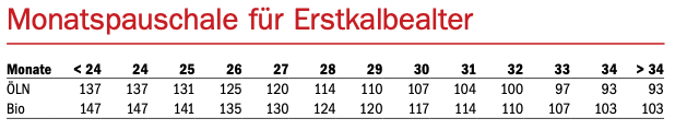 Bei den aktuellen Preisen für die Monatspauschalen gab es kaum Änderungen. Sie werden erst zum Zeitpunkt des Rückkaufs angewendet. Die in der Tabelle aufgeführten «Richtpreise» gelten ab dem 15. August 2025 und sind für Rinder ab 550 kg Lebendgewicht. Für leichtere Tiere wie Jersey ist eine Reduktion der Monatspauschale möglich.