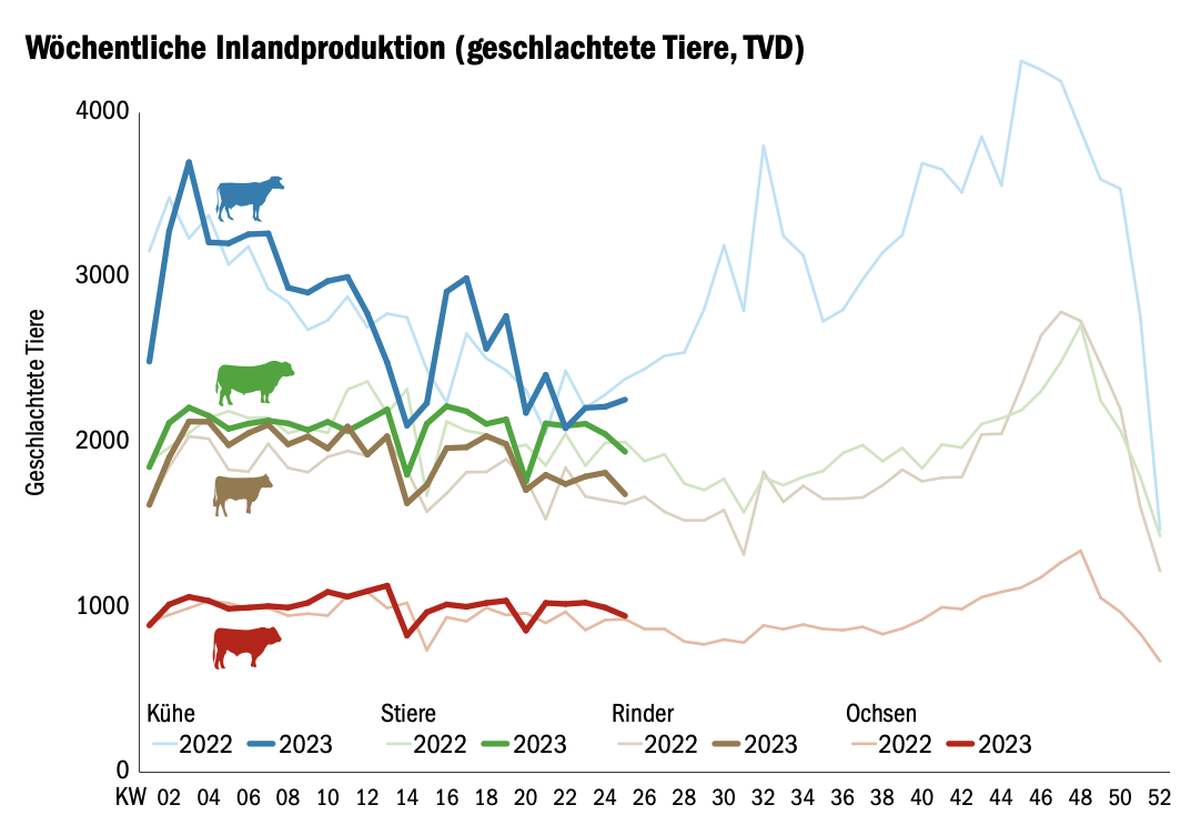 Ebenfalls auf den Schlachtviehmärkten machte sich das etwas grössere Rinderangebot heuer bemerkbar. So stiegen im ersten Halbjahr die Grossviehschlachtungen um 2,5 Prozent, von 188 849 Stück im vergangenen Jahr auf 193 545 Stück heuer. Die grösste Zunahme bei den Schlachtzahlen gab es bei den Kategorien Rindern und Ochsen. So wurden heuer schon 47 864 Rinder, rund 2500 Stück mehr als im ersten Halbjahr 2021, geschlachtet. Bei den Ochsen wurden rund tausend Stück mehr geschlachtet, nämlich 25 179 Tiere. Und auch hier zeigt sich, der Schlachtviehmarkt ist stark vom Wetter und vom Futter abhängig.
