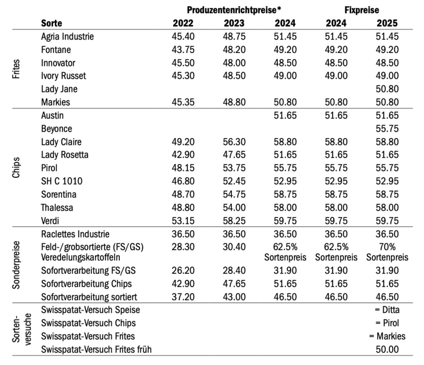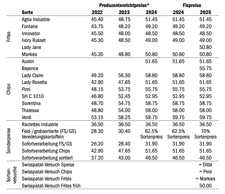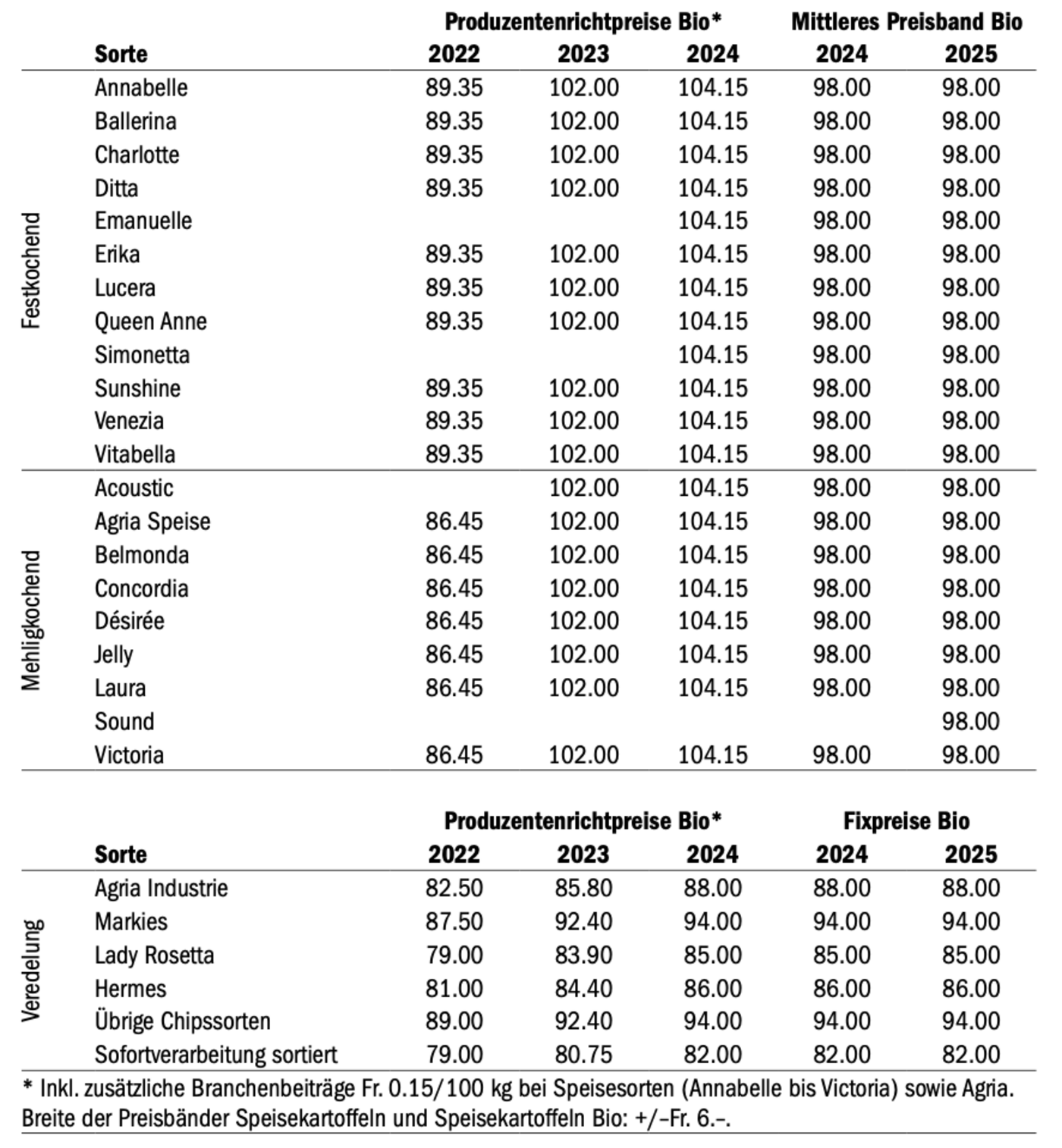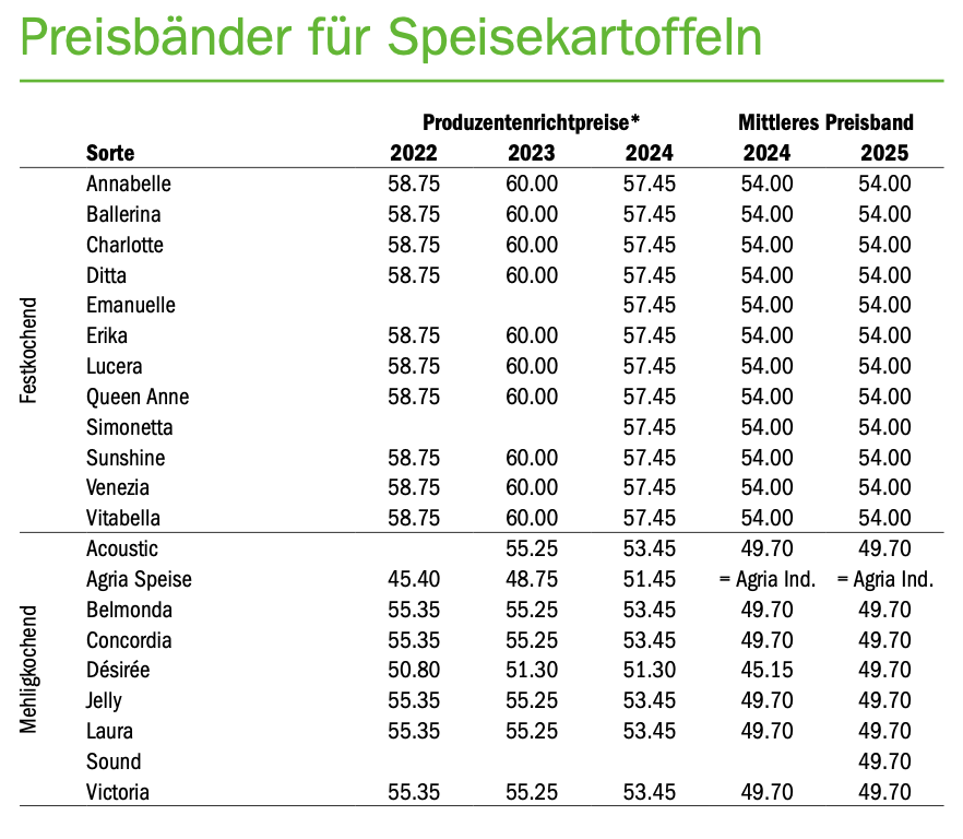Bei den Preisen haben sich die Branchenakteure sowohl für konventionelle wie auch Biokartoffeln auf eine unveränderte Fortführung der bisherigen mittleren Preisbänder sowie der Fixpreise geeinigt. Bei den Veredelungskartoffeln habe sich das im letzten Jahr eingeführte System mit den Fixpreisen bewährt, weshalb auch heuer daran festgehalten wird.Basierend auf den festgelegten mittleren Preisbändern werde Ende August der effektive Produzentenrichtpreis berechnet. Grundlage dafür seien wie bisher die Ergebnisse der Ertragserhebung sowie die Nachfrage nach Kartoffeln. Eine Ausnahme bildeten jene Segmente, bei denen Fixpreise gelten.