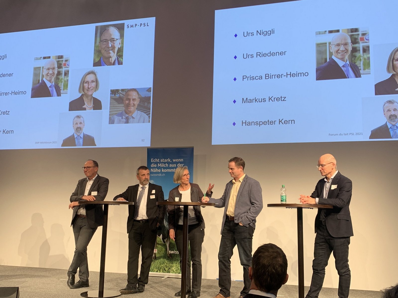 Der Anlass wurde mit einer Podiumsdiskussion abgerundet. Welche Milch brauchen wir für die Zukunft? Wie zeigt sich der Einfluss der Nachhaltigkeitsdebatte in der Wertschöpfungskette Milch? Über diese Themen diskutierten die vier Referent(innen) zusammen mit Hanspeter Kern, Präsident Schweizer Milchproduzenten. Die Podiumsdiskussion wurde von Josef Scherer geleitet, Chefredaktor der BauernZeitung Region Zentralschweiz und Aargau.
