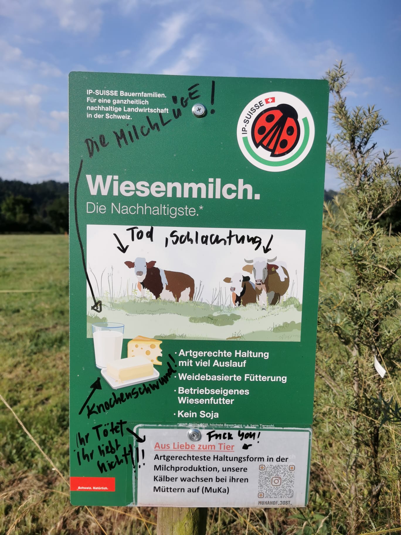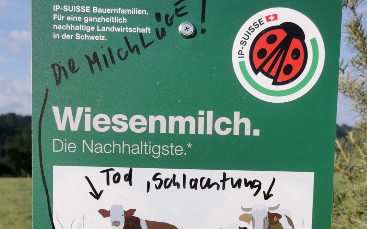 Die IP-Suisse bedauert auf Anfrage der BauernZeitung die Verunstaltung einer Wiesenmilch-Tafel sehr. Der Wille, der IP-Suisse-Bauern, die Gesellschaft transparent zu informieren werde hier sehr strapaziert. «Die geschriebenen Aussagen qualifizieren den Autor aber ausgezeichnet», sagt Geschäftsführer Christophe Eggenschwiler. «Wir wissen aber, dass diese Verunstaltung ein isolierter Fall ist und sicher nicht die Meinung der Mehrheit entspricht», ergänzt er. Falls weitere solche Aktionen beobachtet würden, biete die Geschäftsstelle den betroffenen Produzenten Unterstützung an, ergänzt er.