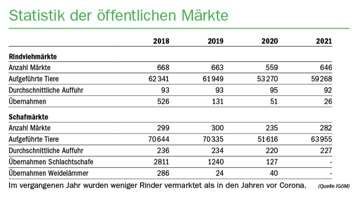 Im vergangenen Jahr fanden 646 öffentliche, von Proviande überwachte Rindermärkte und 282 Schafmärkte statt. Versteigert und taxiert wurden 59 268 Rinder und 63 955 Schafe. Die guten Preise und die rege Nachfrage an diesen Märkten bewirkt auch deren Kopplung an die Inlandleistung.