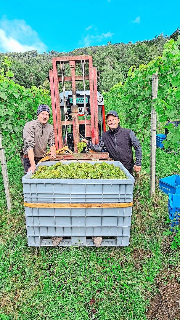 Anfang Winter blicken die beiden Landwirte Matthias und Samuel Schwarz auf die Ernte ihrer zweieinhalb Hektaren Reben auf ihrem 30-Hektaren-Hof zurück. «Wir hatten heuer eindeutig viel Glück mit unseren Reben», zieht Matthias sein Fazit. Sein Bruder Samuel präzisiert: «2024 blieben unsere Reben vom Hagel fast vollständig verschont und wir hatten nur geringe Frostschäden.»