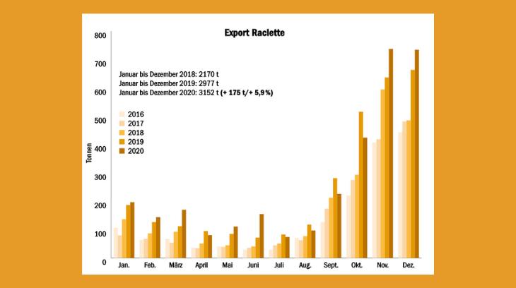 Grosser Gewinner bei den Käseexporten ist Raclette Suisse. Mit einem Plus von 175 Tonnen wurden im vergangenen Jahr 5,9 Prozent mehr Raclette exportiert als noch 2019. Mit total 3152 Tonnen exportiertem Raclettekäse wird im Jahr 2020 ein neuer Rekord aufgestellt. In der Produktion wird gar ein Plus von 1150 Tonnen verzeichnet. Mit insgesamt 16 843 Tonnen produziertem Raclettekäse 2020 sind dies gegenüber 2019 plus 7,3 Prozent. Somit wurden in der Schweiz 975 Tonnen mehr Raclettekäse gegessen.