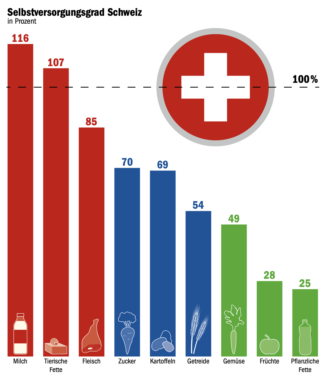 Ein hoher Selbstversorgungsgrad ist gewünscht. Doch seit den 1990er-Jahren, wo dieser noch bei 60 % lag, ist ein Abwärtstrend zu verzeichnen. Der Bund führt diesen darauf zurück, dass die Bevölkerung schneller gewachsen ist als die Nahrungsmittelproduktion.