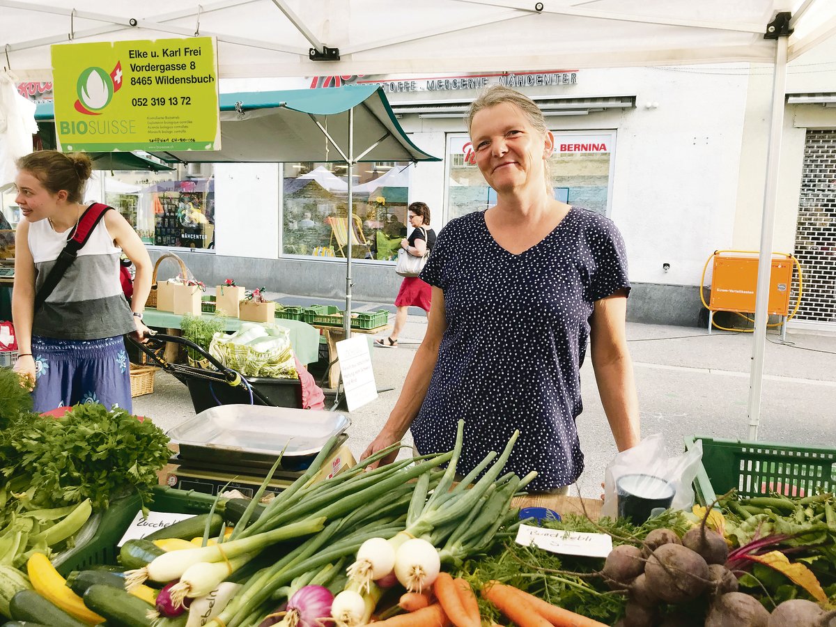 Die Biobäuerin Elke Frei aus Wildensbuch ZH kommt etwa seit 20 Jahren an den Winterthurer Wochenmarkt und gehört hier somit ebenfalls zu den «alten Hasen». Sie sei zu jeder Jahreszeit auf dem Markt, aber im Sommer sei es lockerer, die Stimmung schöner. «Im Winter ist der Aufwand grösser, es braucht viel warme Kleidung und sogar eine Heizung.» Das frühe Aufstehen stört Elke Frei hingegen nicht, das müsse sie ja auch sonst immer. Zu den Nachteilen sagt sie hingegen: «Auf den Markt zu fahren ist aufwendig und benötigt viel Zeit, die dann dafür in der Produktion fehlt. Dafür bringt es mehr Ertrag und auch der direkte Kontakt zu den Kunden gefällt mir sehr.»
