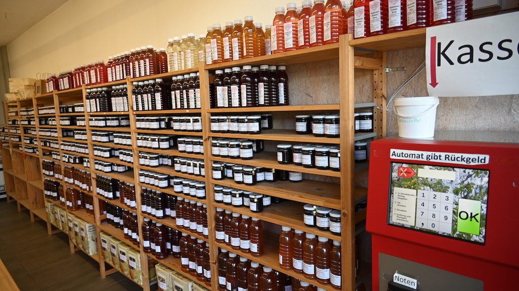 Imposant präsentiert sich die eine Seite des Ladens. Dort stehen Regale mit Sirups und zahlreichen Konfisorten. 52 an der Zahl sollten es eigentlich sein, für jede Woche ein Glas, erklärt Claudia Stüdi und lächelt. Alles ist aus eigenem Obst hergestellt. Auch der Süssmost sowie Süssmost spezial, der mit Beeren, Kirschen oder Blütensaft angereichert ist. Am Freitag und Samstag gibt es ein reichhaltiges Angebot an Brot und Zopf, welches mit langer Teigruhe in der hofeigenen Bäckereistube hergestellt wird.