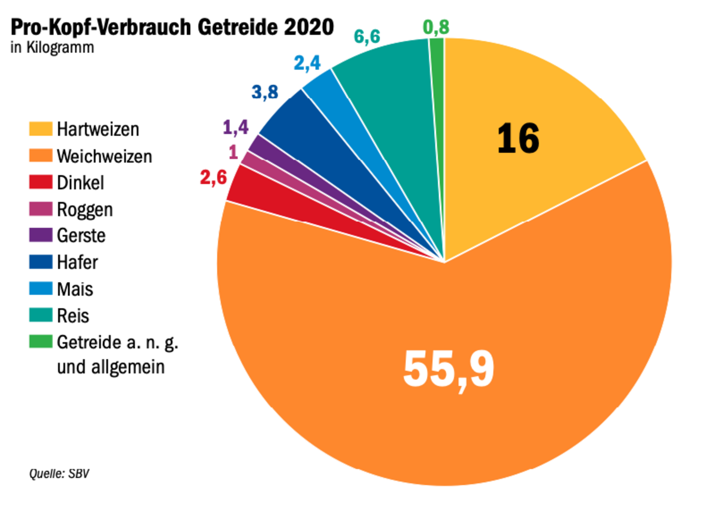 90,5 kg Getreide ass jeder Schweizer im Jahr 2020. Den weitaus grössten Anteil davon macht Weichweizen mit 55,9 kg aus, auf dem zweiten Platz ist Hartweizen mit 16 kg. Der Selbstversorgungsgrad der Schweiz für Getreide zur Nahrungsmittelproduktion liegt bei rund 54 %. Also isst jeder Schweizer knapp 49 kg einheimisches Getreide.