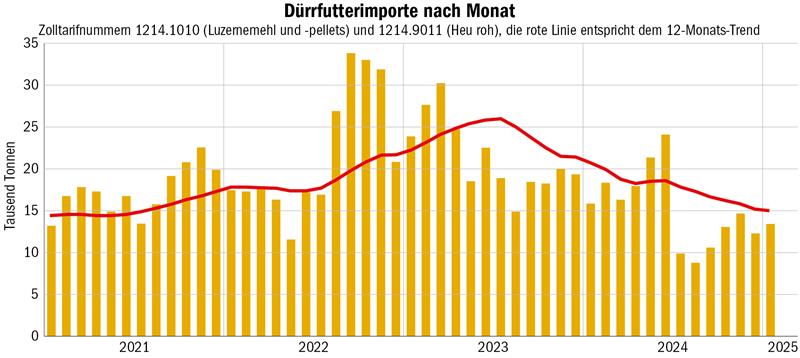 Diese Rückmeldung kam aus allen Regionen der Schweiz und von den deutschen Händlern war das Gleiche zu hören. Im Bio-Segment läuft es ähnlich schlecht. Zudem belasten die Finanzen die Bauernfamilien. Sie würden erst kaufen, wenn sie wirklich müssten. «Vermehrt kaufen die Landwirte Importluzerne. Durch die Senkung der Zolltarife kommt es sie billiger, als einheimisches und top belüftetes Heu zu kaufen», sagte Fabian Gut.