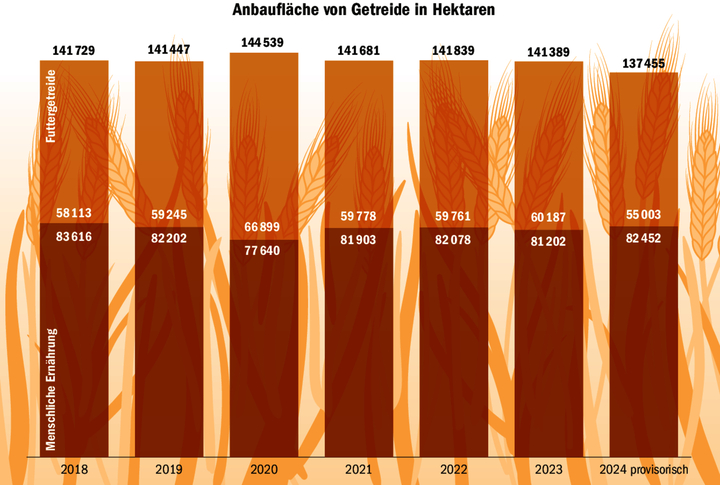 Insgesamt resultiert aus der diesjährigen Ernte eine backfähige Brotgetreidemenge von 250'773 t. Im vergangenen Jahr lag die Menge Brotgetreide bei 373'136 t, der Durchschnitt der letzten zehn Jahre liegt bei 389'704 t. Die Durchschnittserträge sind heuer bei allen Brotgetreidekulturen sehr tief und liegen um mehr als 30 % unter dem Durchschnitt der letzten zehn Jahre.