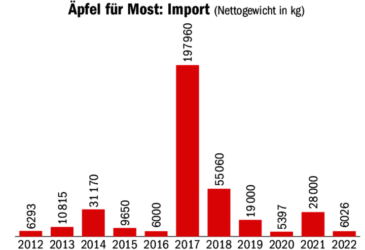 Gemäss Ernteerhebung wurden bisher rund 4480 t Mostäpfel (11 % der Vorernteschätzung) sowie rund 204 Tonnen Mostbirnen (7 % der Vorernteschätzung) verarbeitet. Davon sind 4100 t SGA-Mostäpfel, 188 t SGA-Mostbirnen sowie 380 t Bio-Mostäpfel und 15 t Bio-Mostbirnen. Der gemessene Oechslegrad liegt bei den bisher geernteten Mostäpfeln und Mostbirnen durchschnittlich bei 47,2° respektive 47,1° Oechsle. Dies weist auf eine sehr gute Qualität der geernteten Menge hin.