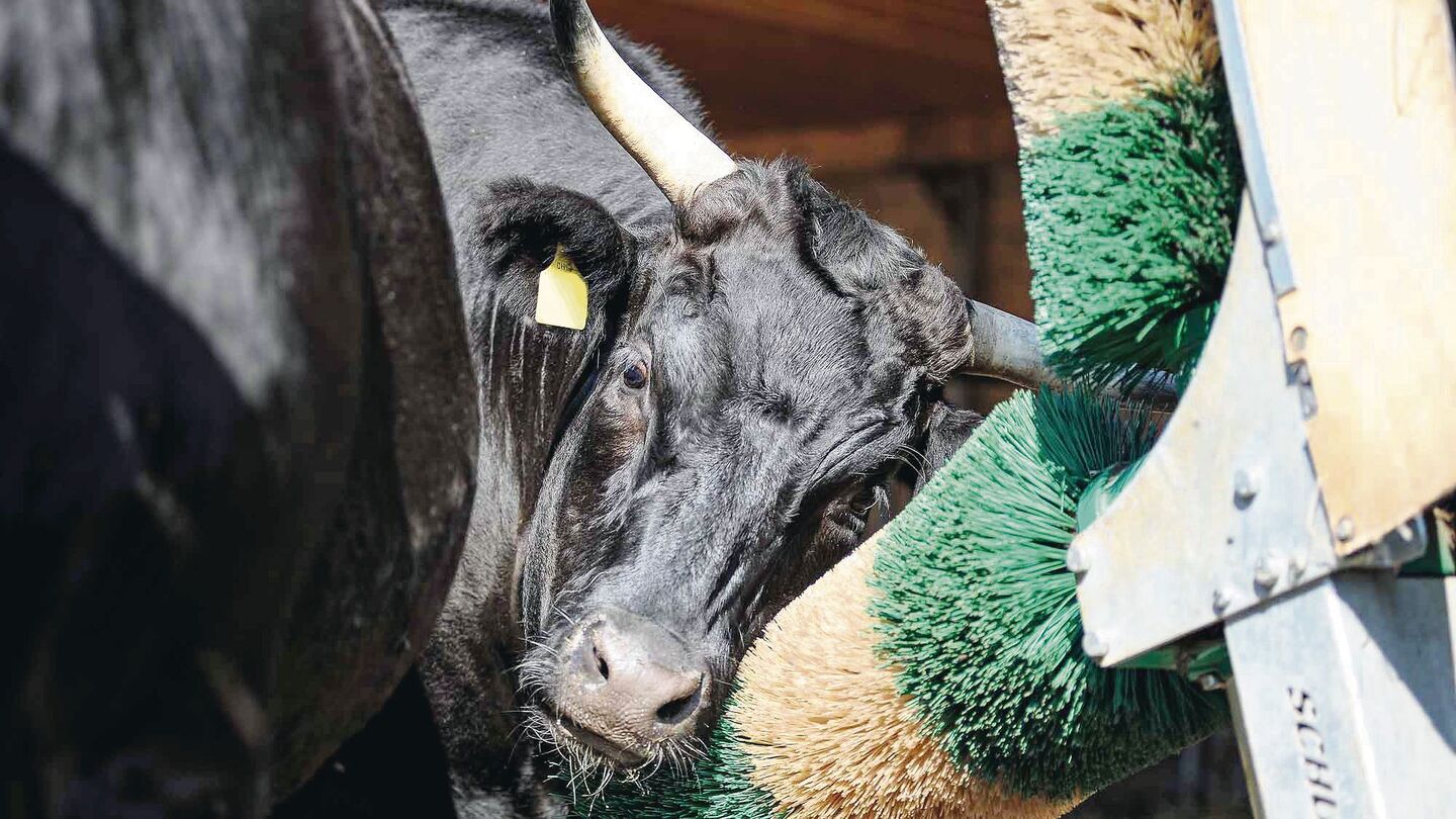 Sein Erfindergeist beschränkt sich jedoch keinesfalls auf das Bier. Auch seine Kuhställe kommen nicht vom Fliessband, sondern wurden den bestehenden Gebäuden und dem Tierwohl angepasst. Grosse, leicht zu reinigende Krippen, helle, gut belüftete Liegebereiche, riesige Laufhöfe, grosszügige Tiefstreu-Liegebereiche. So hat er eine Kratzbürste patentieren lassen, die den Tieren unten am Bauch krault: «Wo sind die Tiere schmutzig? Unten am Bauch und an der Seite, dort wo keine Kratzbürste hinkommt», so Hunkeler. So stehen in den Laufhöfen nun umgedrehte Kratzbürsten an denen sich die Tiere genüsslich den Bauch kraulen lassen. Diese Idee kommt offensichtlich an.