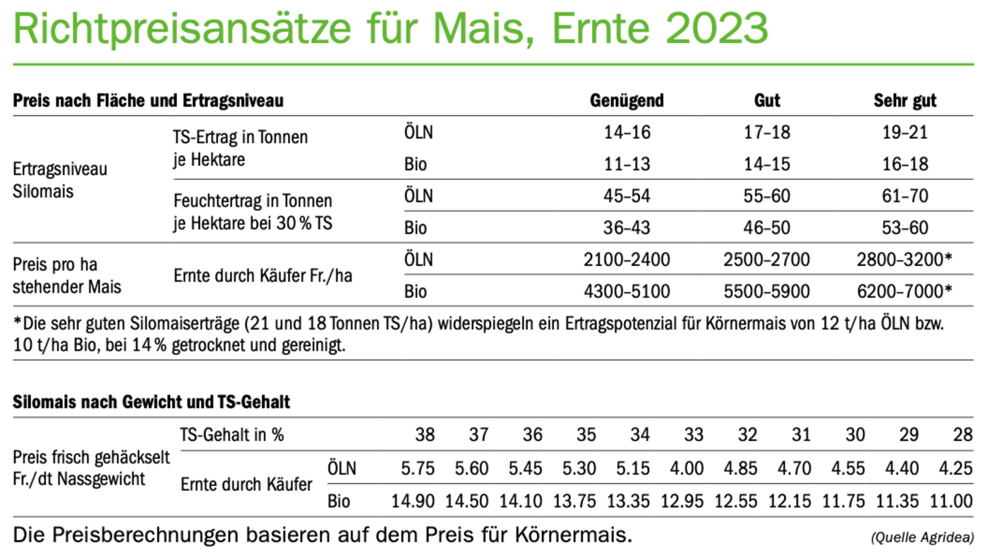 In diesen Tagen publiziert Agridea die Richtpreise für den heurigen Maishandel. Diese basieren auf dem Preis für Körnermais. Da sich die Branche in diesem Jahr nicht auf einen Richtpreis für Körnermais einigen konnte, basieren die Preisberechnungen für Silomais auf dem Richtpreis vom vergangenen Jahr.