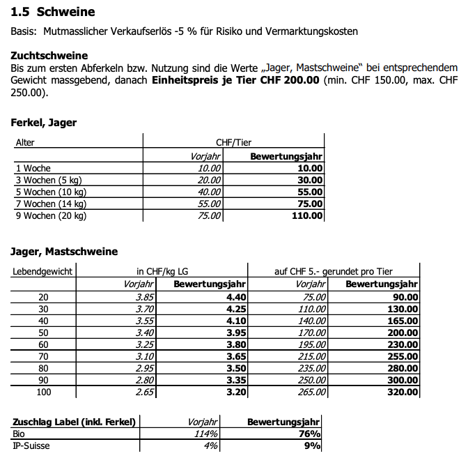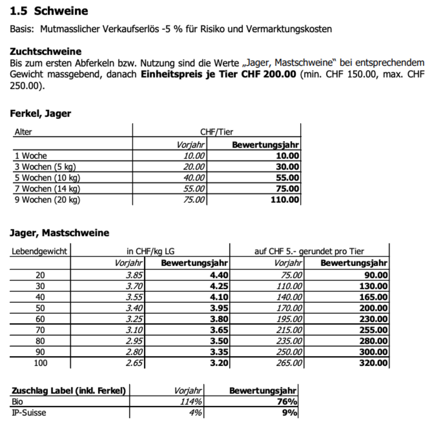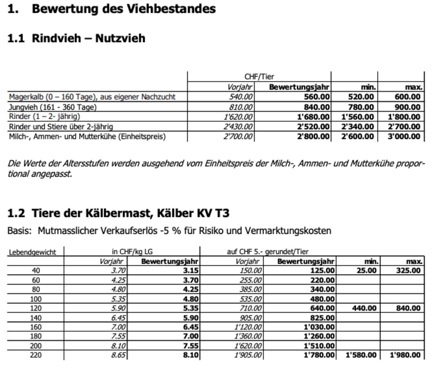 Bei der Bewertung der Tierbestände wird auf die aktuellen Preise für Zucht- und Nutzvieh abgestellt. Dabei werden beide Kanäle berücksichtigt, mit einer Gewichtung von 80 % ist jedoch der Schlachtpreis massgeblicher. Bei Mastvieh wird der mutmassliche Markterlös per Ende Jahr geschätzt.