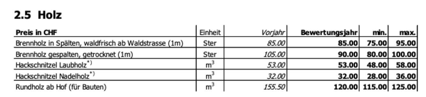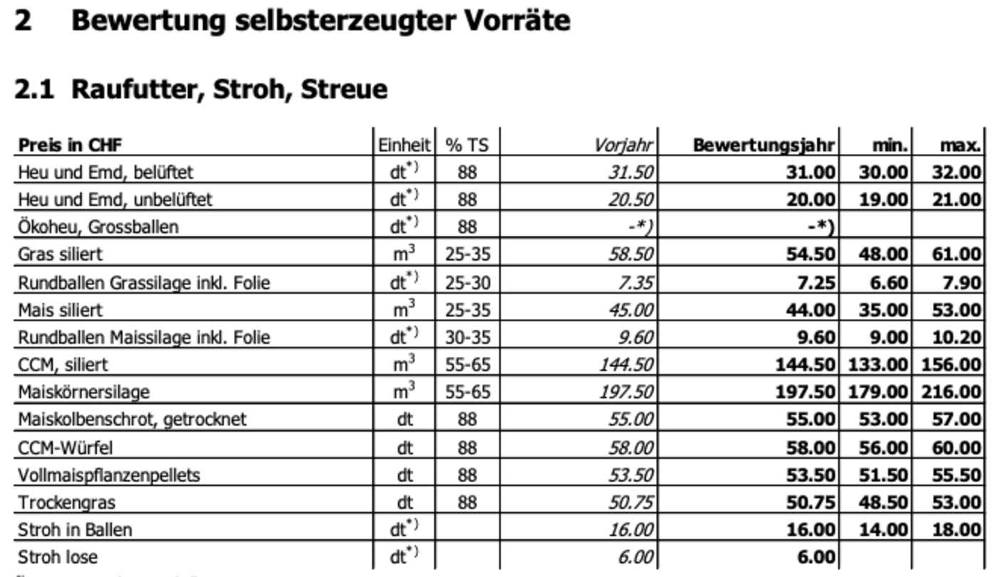 Nahezu unverändert sind die Preise gegenüber dem Vorjahr für Futtervorräte, Getreide oder Holzvorräte. Ebenfalls bewertet werden in der Inventur Naturalbezüge durch die Betriebsleiterfamilie oder Angestellte. Diese können auch pauschal oder gemäss Direktvermarktungspreisen berechnet werden.