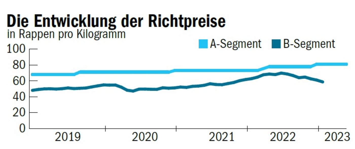 Laut Statistik von TSM Treuhand sind die Exporte in den ersten elf Monaten 2022 um 7,1 Prozent gesunken. Derweil haben die Importe nur 3,3 Prozent nachgelassen, womit sich die Handelsbilanz verschlechtert hat. Gleichzeitig haben die Preise auf den internationalen Märkten markant nachgelassen, wie die Grafik auf der gegenüberliegenden Seite zeigt. Das schlägt auf den B-Richtpreis und damit auf die heimischen Produzentenpreise durch. Dieser Effekt wird noch verstärkt durch die Rückkehr zum üblichen Abzug für den Fonds Rohstoffverbilligung (4,5 Rp./kg). Dieser war für die letzten vier Monate 2022 um 2 Rp. reduziert worden.