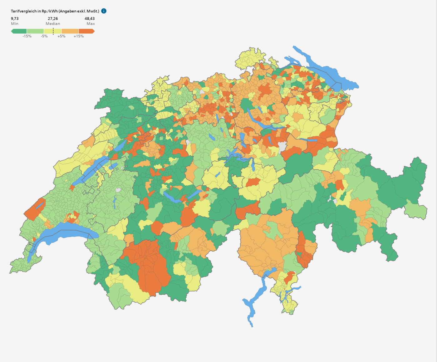 Die Strompreis-Karte der Eidgenössischen Elektrizitätskommission (Elcom) präsentiert sich auch in diesem Jahr bunt gescheckt. Die Farben verdeutlichen die Unterschiede in den Tarifen: In grünen Gemeinden zahlt man im Vergleich zum Vorjahr weniger, in roten Gebieten mehr. Schweizweit steigen die Strompreise 2024 in der Grundversorgung für Haushalte im Mittel um rund 18 Prozent.
