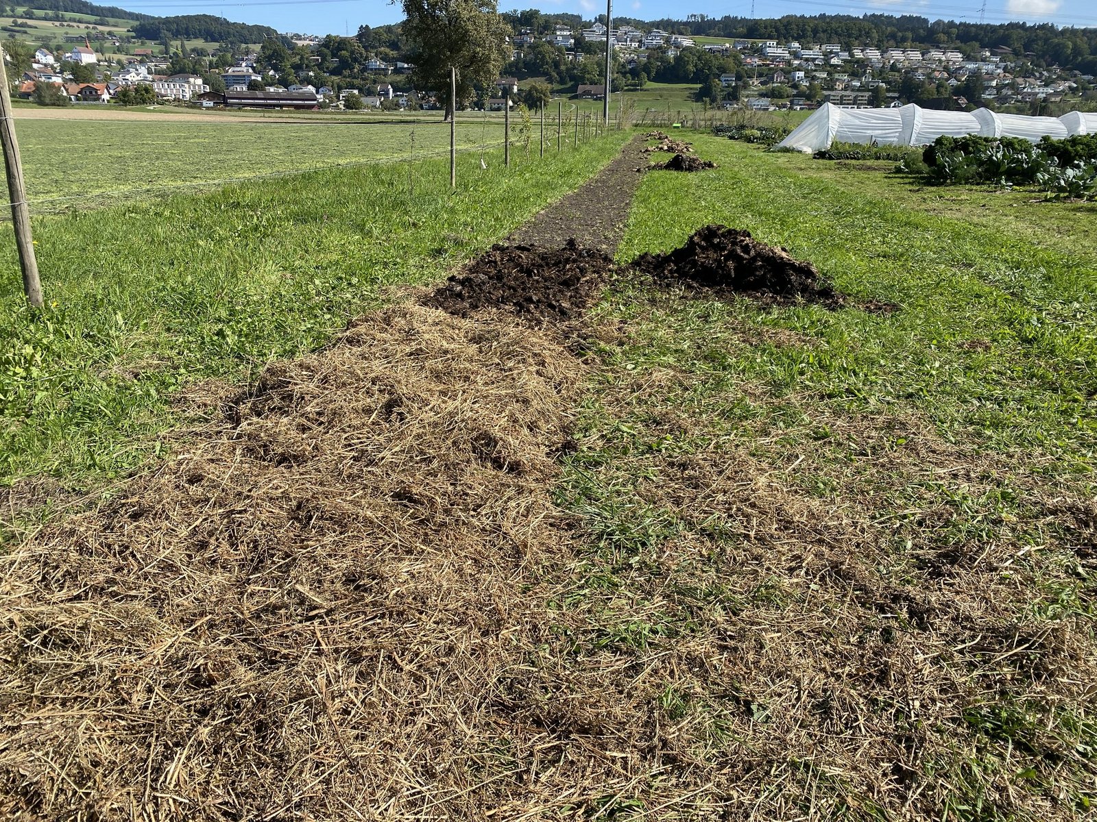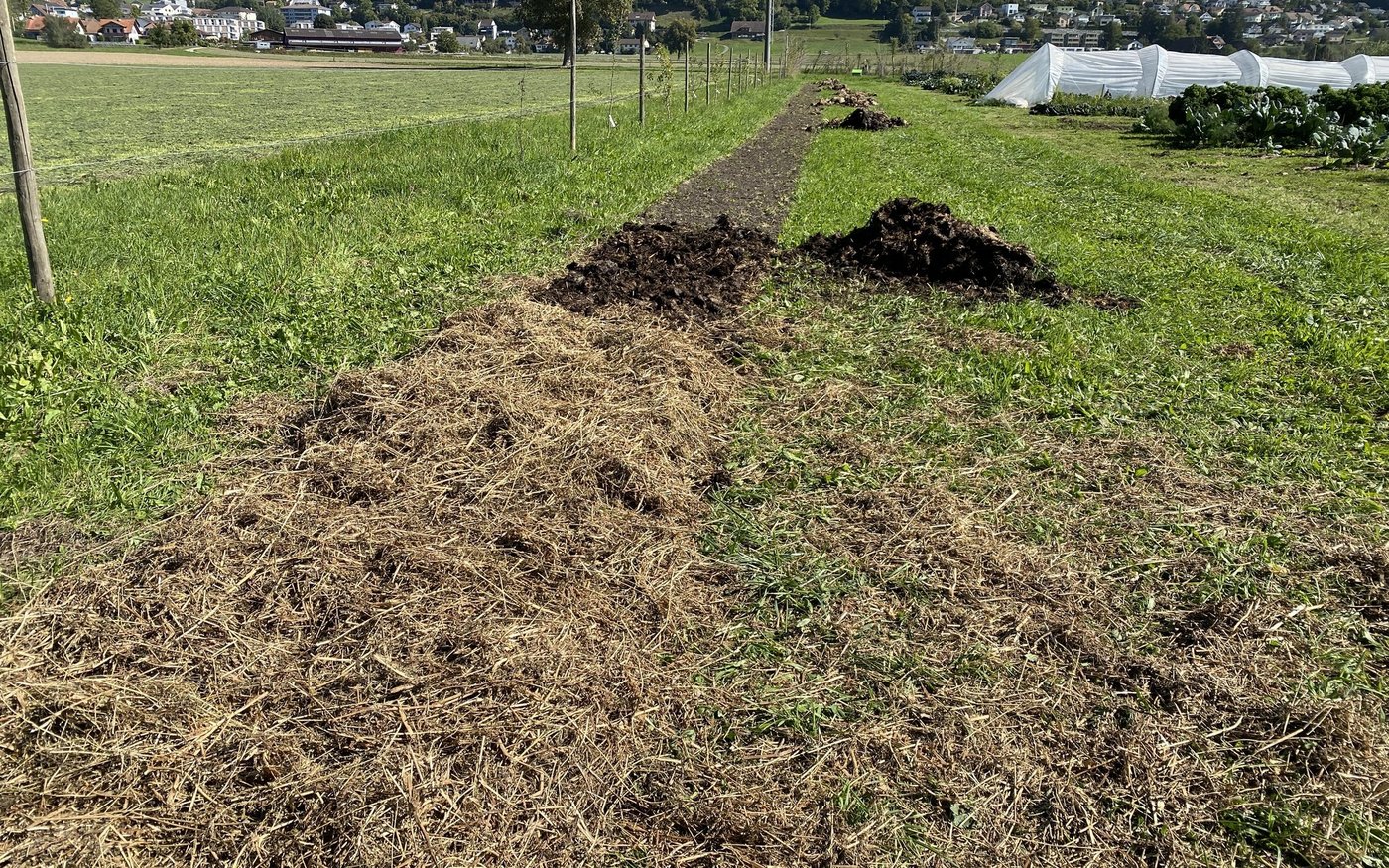 Bedeckter Boden im Gemüsebau Der Kabis gedeiht prächtig in 12 Zentimeter dickem Mulch Wednesday, 7. December 2022 Im Tunnel wächst das Gemüse mit Mist als Dünger und einer dicken Mulchschicht aus Stroh, draussen bedeckt Ökoheu die Beete. Der Boden wird nicht bearbeitet, Humusaufbau ist das Ziel. «Im Freiland zersetzt sich der Mulch viel schneller als drinnen mit der Tröpfchenbewässerung. Nach etwa drei Sätzen Salat mulchen wir von Hand nach.» Noch erfolgt das Setzen mit einem Akkubohrer, der ein Loch in Mulch und Boden bohrt. Künftig wollen die Luzerner eine selbst konstruierte Maschine dafür einsetzten. «Es ist uns wichtig, dass wir diese Handarbeit durch effiziente Maschinen ersetzen kann», sagt Dario Heller. Das Ziel ist eine weitere Steigerung der Arbeitseffizienz.
