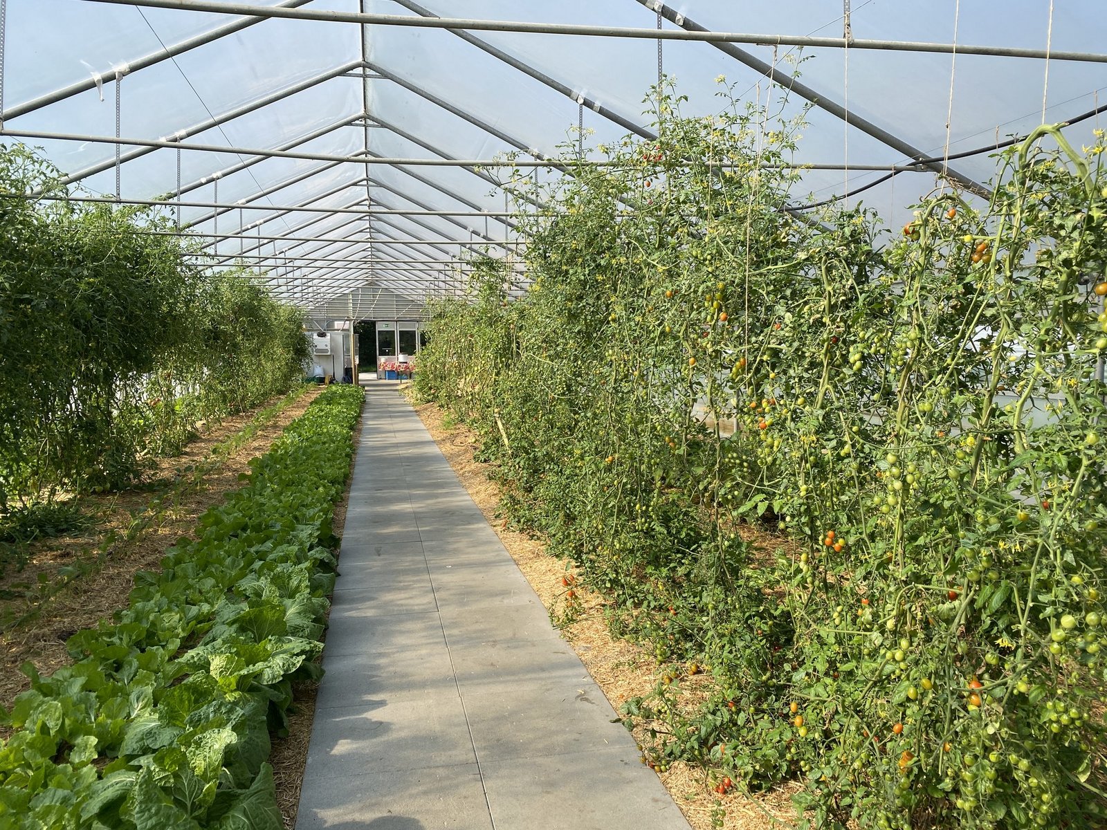 Familie Heller bietet ihren Abonnenten die Möglichkeit auch eigene Projekte zu realisieren. Dies unter der Voraussetzung, dass sie selbst die Verantwortung übernehmen und am Ende alle davon profitieren können. So hat eine 8-köpfige Gruppe in einer feuchten Ecke der von Hecken als Windschutz umstandenen Fläche eine Pilzzucht eingerichtet. «Wir haben Material, das wir gerade zur Hand hatten und das Flüssigmyzel zur Verfügung gestellt», erzählt der Junglandwirt. Tatsächlich konnten einige Edelpilze geerntet werden und der runde Platz mit den grossen Holzkästen wirkt sorgfältig gestaltet und aufgebaut. «Damit schaffen wir auch eine Bindung zu der Fläche», ist Dario Heller überzeugt. Das Gewächshaus selbst wurde zu einem gemütlichen Treffpunkt: Zwischen Tomaten, Peperoni und Kräutern befindet sich ein Aufenthaltsraum mit Holztischen und einem Töggelitisch.