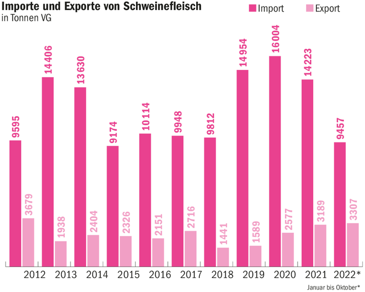 Dass sich die Branche weitgehend solidarisch verhält und versucht, das gestiegene Inlandangebot zu verwerten, zeigen die deutlich gesunkenen Importe, die von Januar bis Oktober nochmals rund 20 Prozent tiefer waren als in der gleichen Vorjahresperiode. Gegenüber einem normalen Inlandangebot sind die Importe heuer rund ein Drittel tiefer.