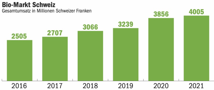 Erstmals setzten Detailhandel und Direktermarktung mehr als vier Milliarden Franken mit Bio-Produkten um, schreibt Bio Suisse. Der Marktanteil der Bio-Produkte am Gesamtmarkt stieg um 0,6% auf 10,9%. «Ich bin sehr stolz, dass wir dieses Ziel erreicht haben, weil wir auch 2020 coronabedingt ein immenses Wachstum hatten», sagte Balz Strasser, Geschäftsführer der Bio Suisse.