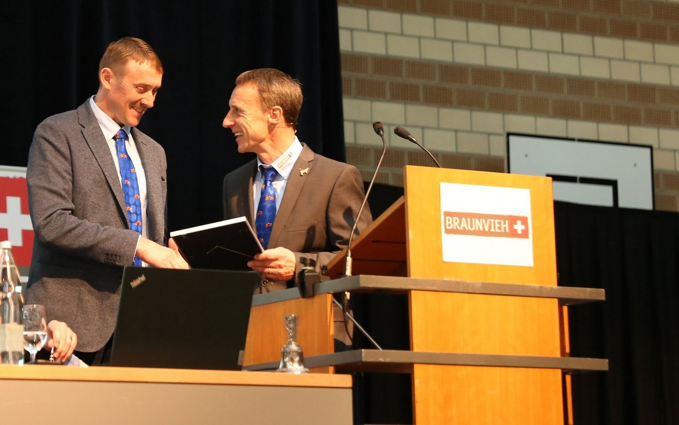 Eine erfreuliche Aufgabe hatte Vizedirektor Andreas Kocher: Er durfte die Besitzer von 50 Braunviehkühen für ihre langlebigen Tiere ausgezeichnet. Geehrt wurde auch der abtretende Verbandspräsidenten Reto Grünenfelder, der von den Delegierten zum Ehrenpräsidenten gewählt wurde.
