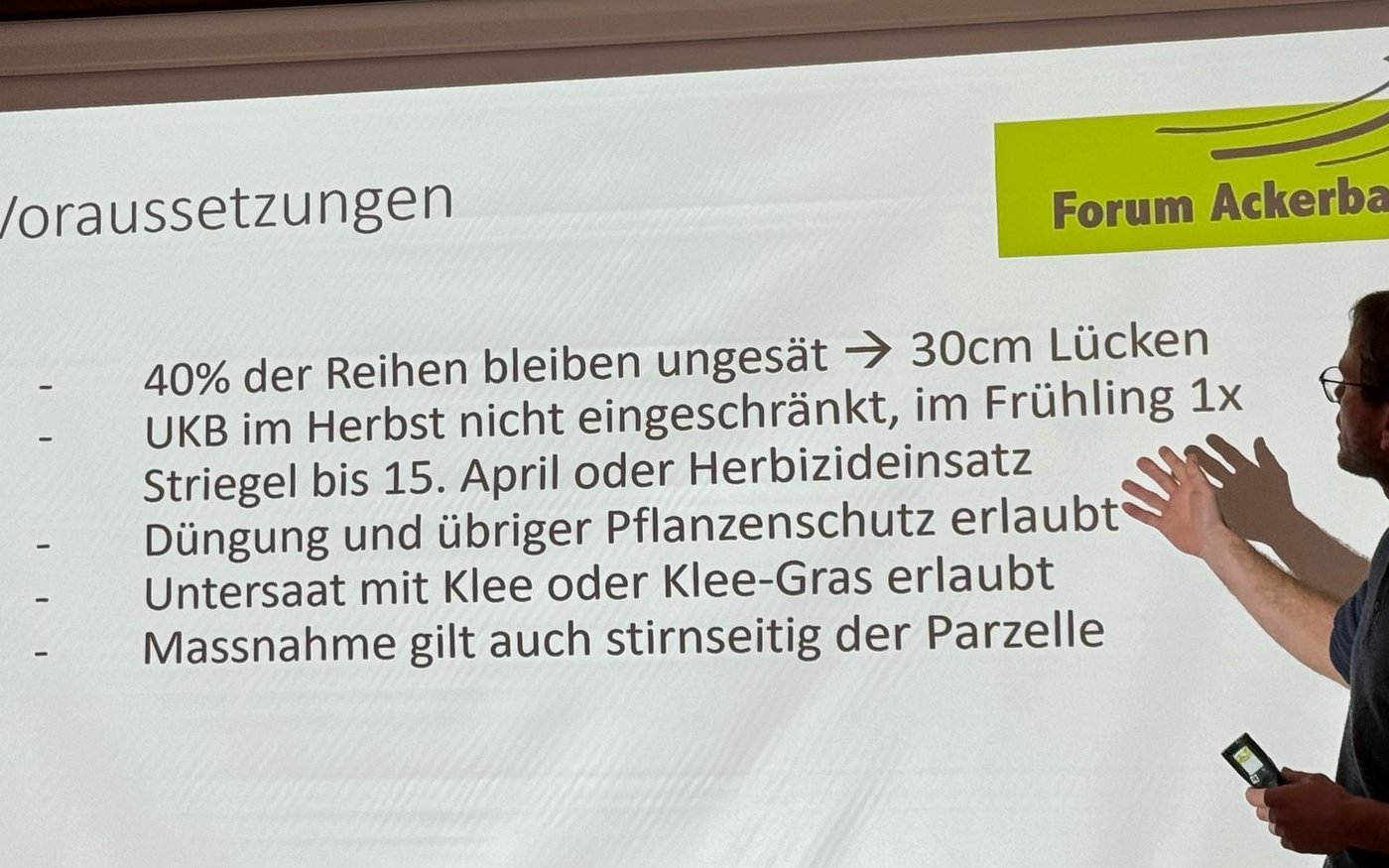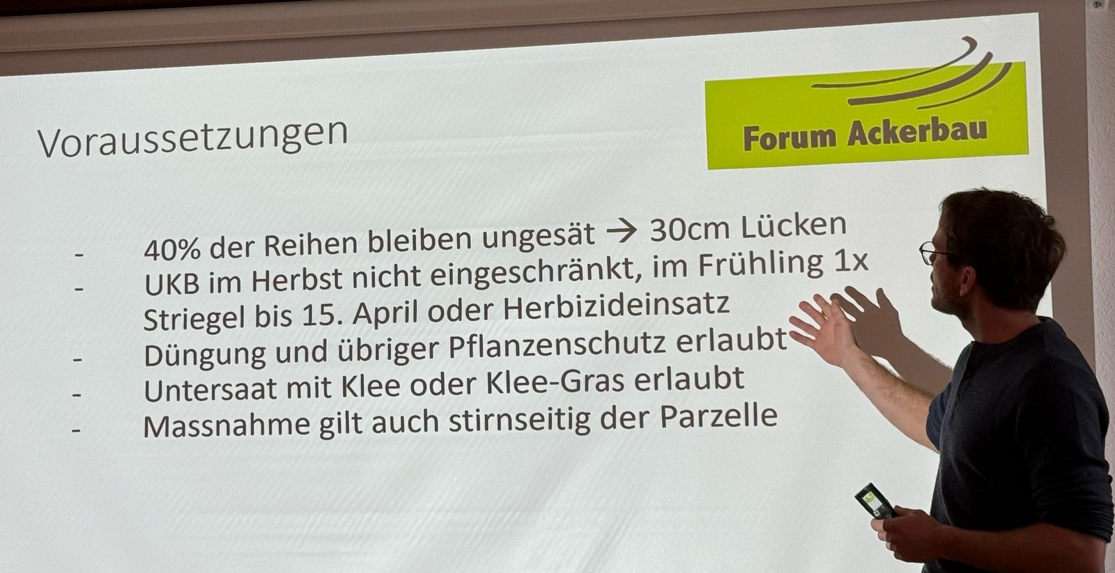 Am Schluss der GV und vor dem Mittagessen, stellte Martin Bärtschi, vom Strickhof, die Resultate vom Versuch «Weizen in weiter Reihe» vor. Dieser wurde vom Forum Ackerbau über zwei Jahre an acht Versuchsstandorten durchgeführt.