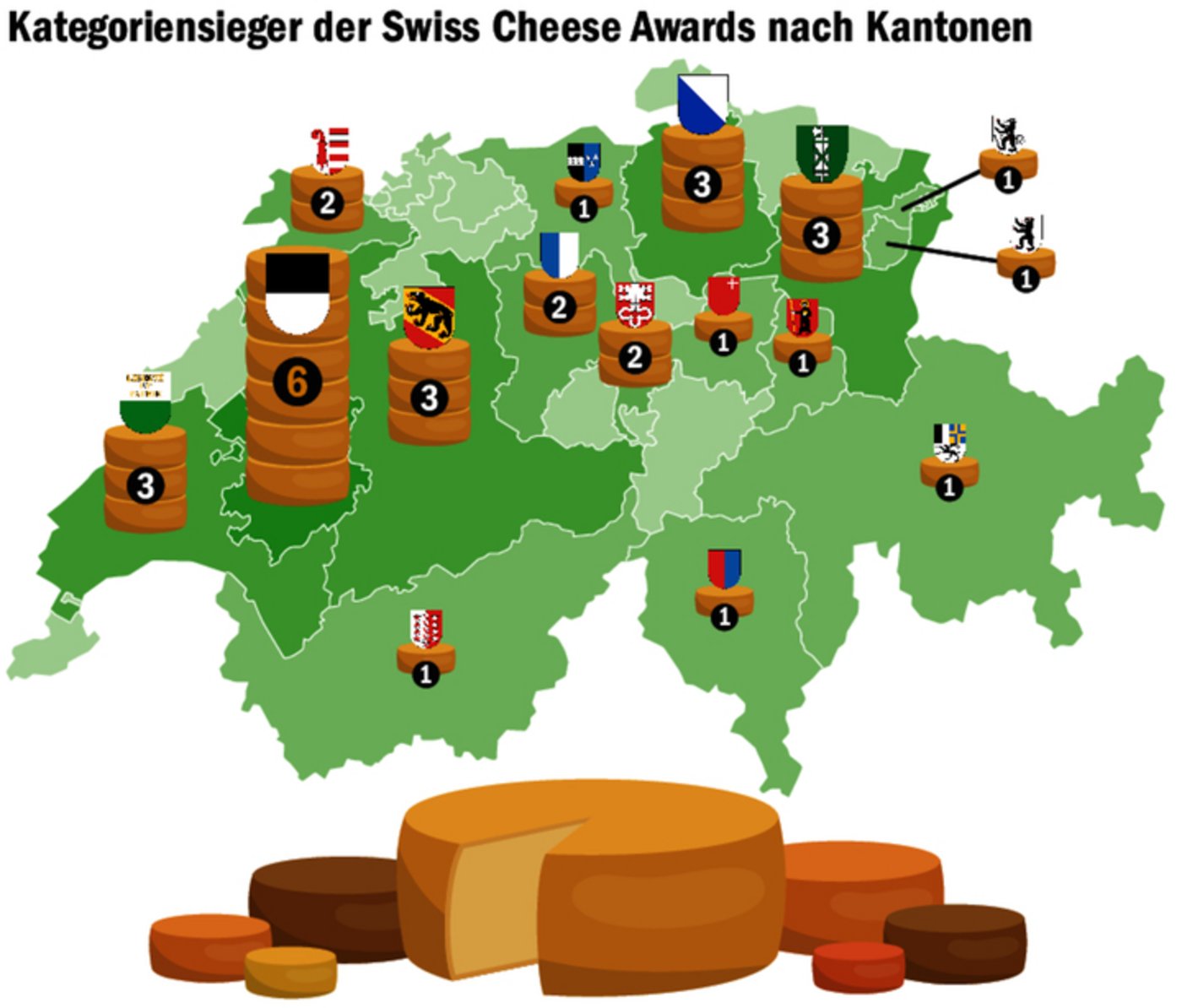 An den Swiss Cheese Awards am 4. Oktober in Lugano TI wurden die besten Schweizer Käse ermittelt. Aus 32 Kategoriensiegern (in der Grafik nach Kantonen aufgeschlüsselt) wählte eine internationale, 37-köpfige Jury die Gewinner.