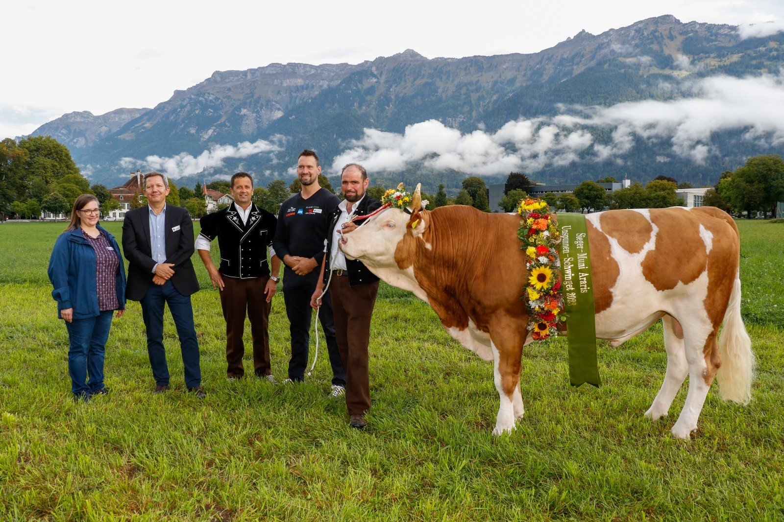 Mit von der Partie war auch Kilian Wenger, der als Taufpate amtete. Der Schwingerkönig von 2010 überragte zwar die anderen Anwesenden, aber der bereits 600 kg schwere Aararis wirkte trotzdem alles andere als klein neben Wenger. Bis zu seinem Auftritt im nächsten Jahr wird der Siegermuni aus dem Stall von Andrea und Hansueli Abersold in Beatenberg BE gut 1000 kg wiegen.