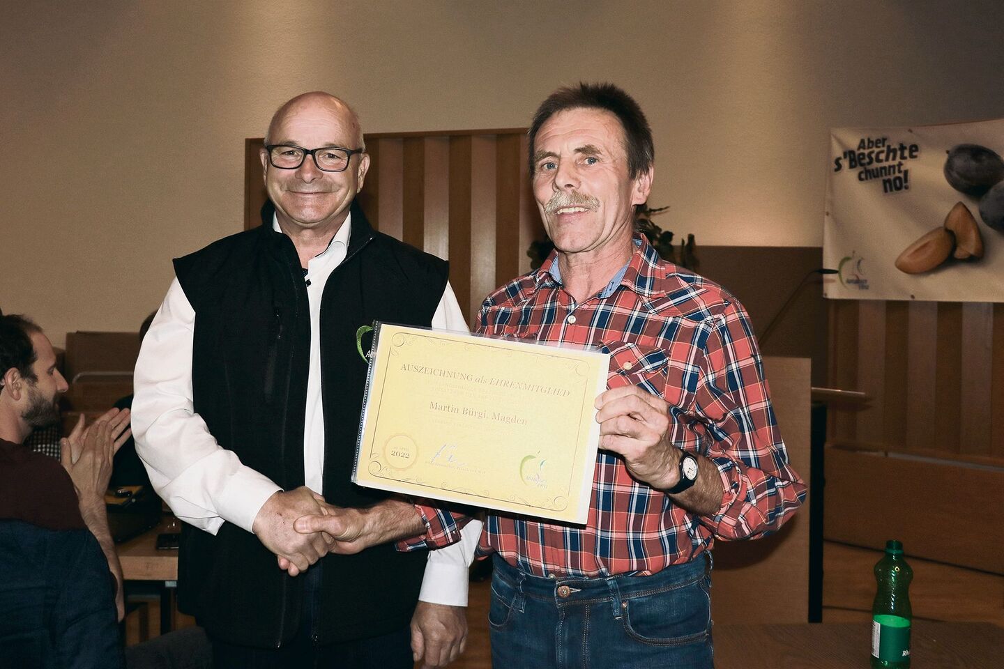 Martin Bürgi übergibt seinen Posten an Ruedi Obrist und tritt künftig etwas kürzer. Der Mann mit den roten Turnschuhen als Markenzeichen bekam für seinen langjährigen Einsatz zugunsten des Aargauer Obstbaus die Ehrenmitgliedschaft beim VAOP.
