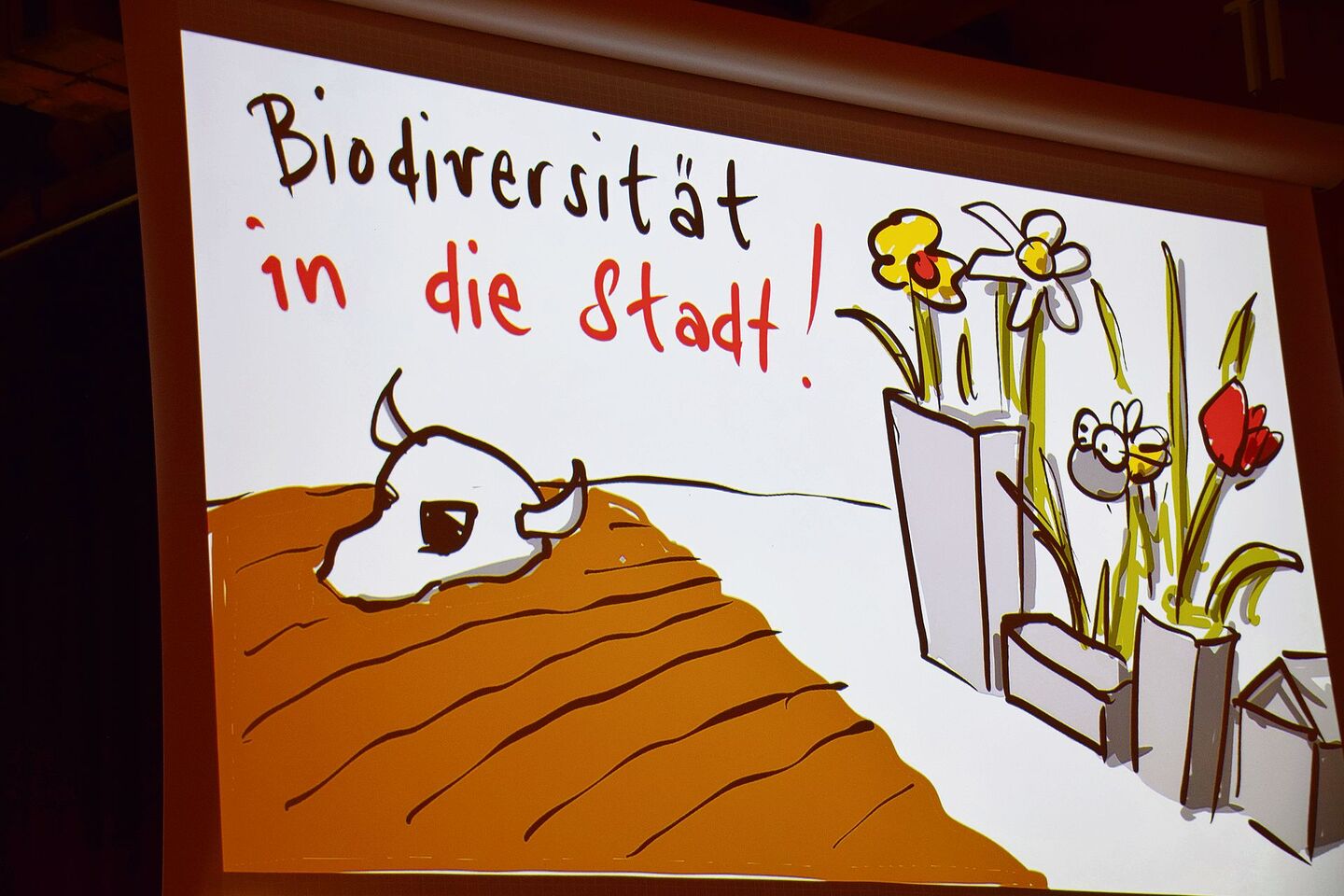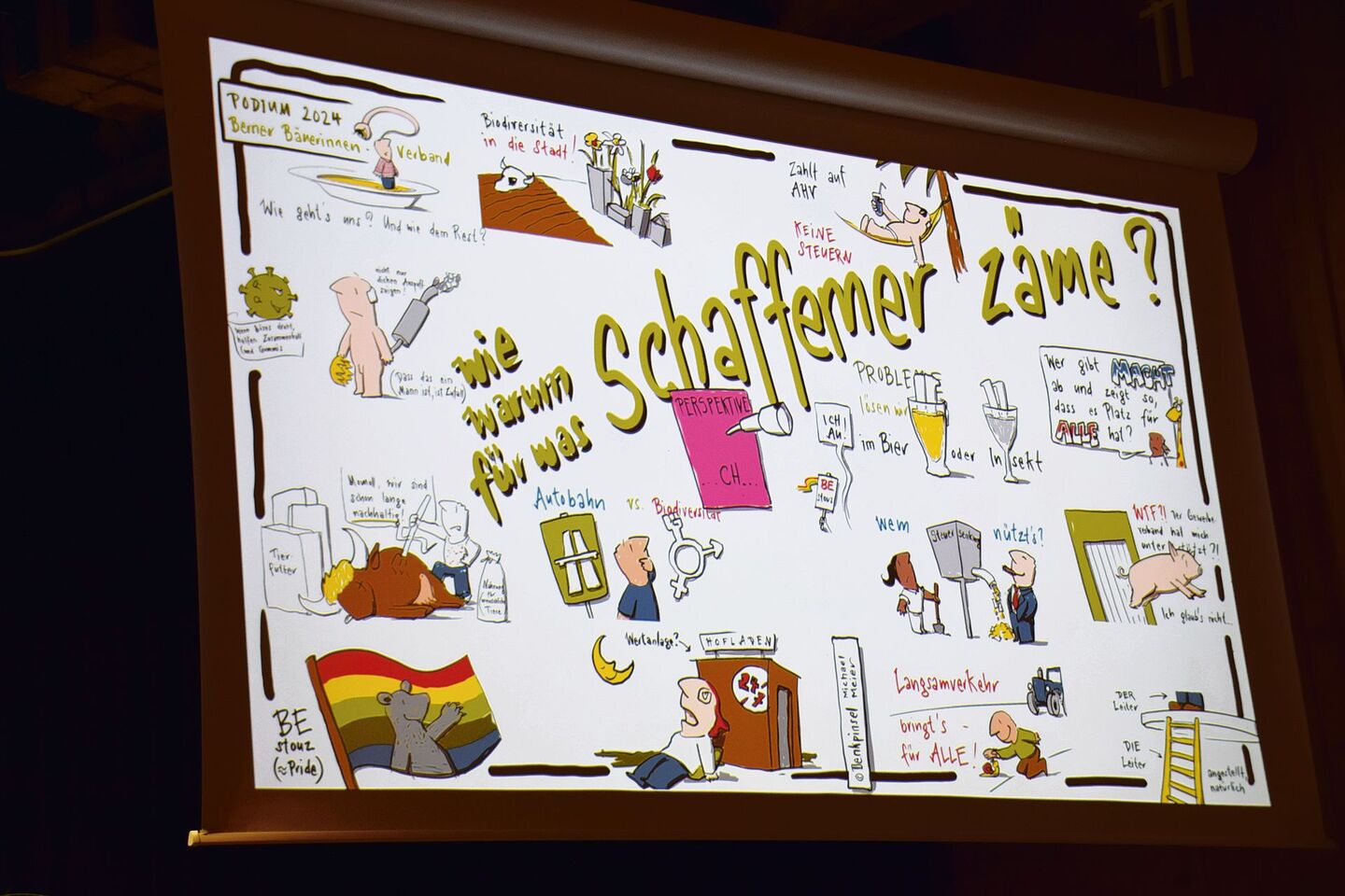 Die Aargauer Bauerntochter und Komödiantin Patti Basler moderierte den Anlass und Michael Meier visualisierte die Diskussion und widerspiegelte mit seinen Zeichnungen die Diskussionspunkte, ergänzt mit einer Prise Humor, aber auch kritischen Bemerkungen. Als Veganer schimmerte dies auch ab und zu bei seinen Zeichnungen durch, was nicht allen Anwesenden gefiel. Es ist nicht einfach, die Veranstaltung in einem Lauftext zusammenzufassen. Wir präsentieren Ihnen deshalb ein paar Statements der Podiumsbeteiligten. Meistgefallenes Zitat: «Wir arbeiten eng mit der Landwirtschaft zusammen.»