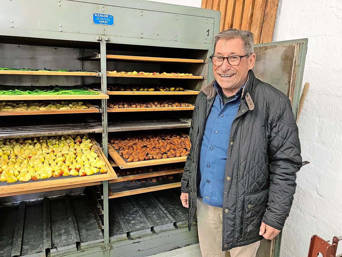 Morgens um zehn vor neun: Kurz bevor Peter Hauri die Türe zur Dörranlage schliesst, kommt die letzte Kundin mit einer Schüssel Bohnen vorbei. Die Frau legt die Hülsenfrüchte sorgfältig auf ein Gitter, das der Dörrmeister anschliessend in den Ofen schiebt. Darin sind bereits Äpfel, Birnen und Baumnüsse parat. Dann kann es losgehen: Hauri heizt die beiden Schränke auf 60 Grad auf. Bald macht sich die Aktivität der Öfen durch ein lautes Wummern bemerkbar.