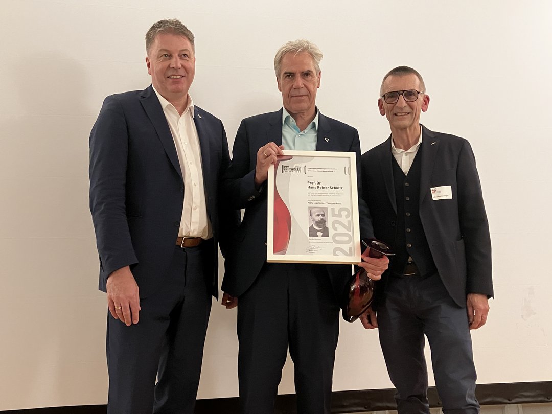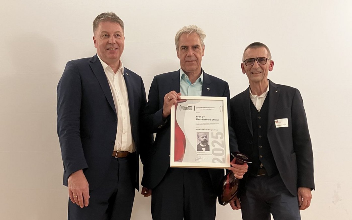 Anlässlich der Jubiläumsfeier wurde zudem der Professor-Hermann-Müller-Preis der Geisenheim Alumni Association verliehen. Der diesjährige Preisträger ist Hans Reiner Schultz, Präsident der Hochschule Geisenheim University (D) und weltweit führender Forscher im Bereich Klimawandel und Weinbau. Der Preis würdigt seit den 1970er Jahren Persönlichkeiten, die sich in ausserordentlichem Mass für die Ausbildung und Forschung im hessischen Geisenheim verdient gemacht haben. Traditionellerweise findet die Verleihung in Deutschland statt. «Dass die Preisübergabe diesmal in Wädenswil stattfindet, bringt die Verbundenheit zwischen den beiden Forschungsstandorten zum Ausdruck», betonte Robert Lönarz, Präsident des Alumni-Verbands der Hochschule Geisenheim.