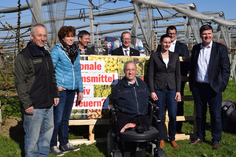 Der Anlass fand inmitten der Obstanlage von Biobauer Kurt Henauer in Kesswil statt. Er legte dar, welche Folgen die Annahme der Initiativen für seinen Betrieb hätten. Da sei zum Ersten einmal, dass auch Biobetriebe ohne die Hilfsstoffe die gewünschte Produktqualitäten nicht mehr erreichen könnten.