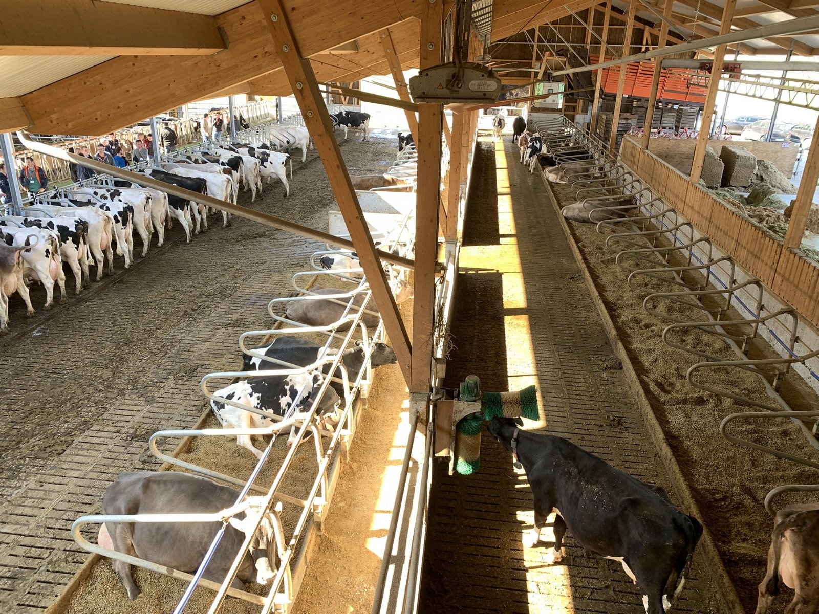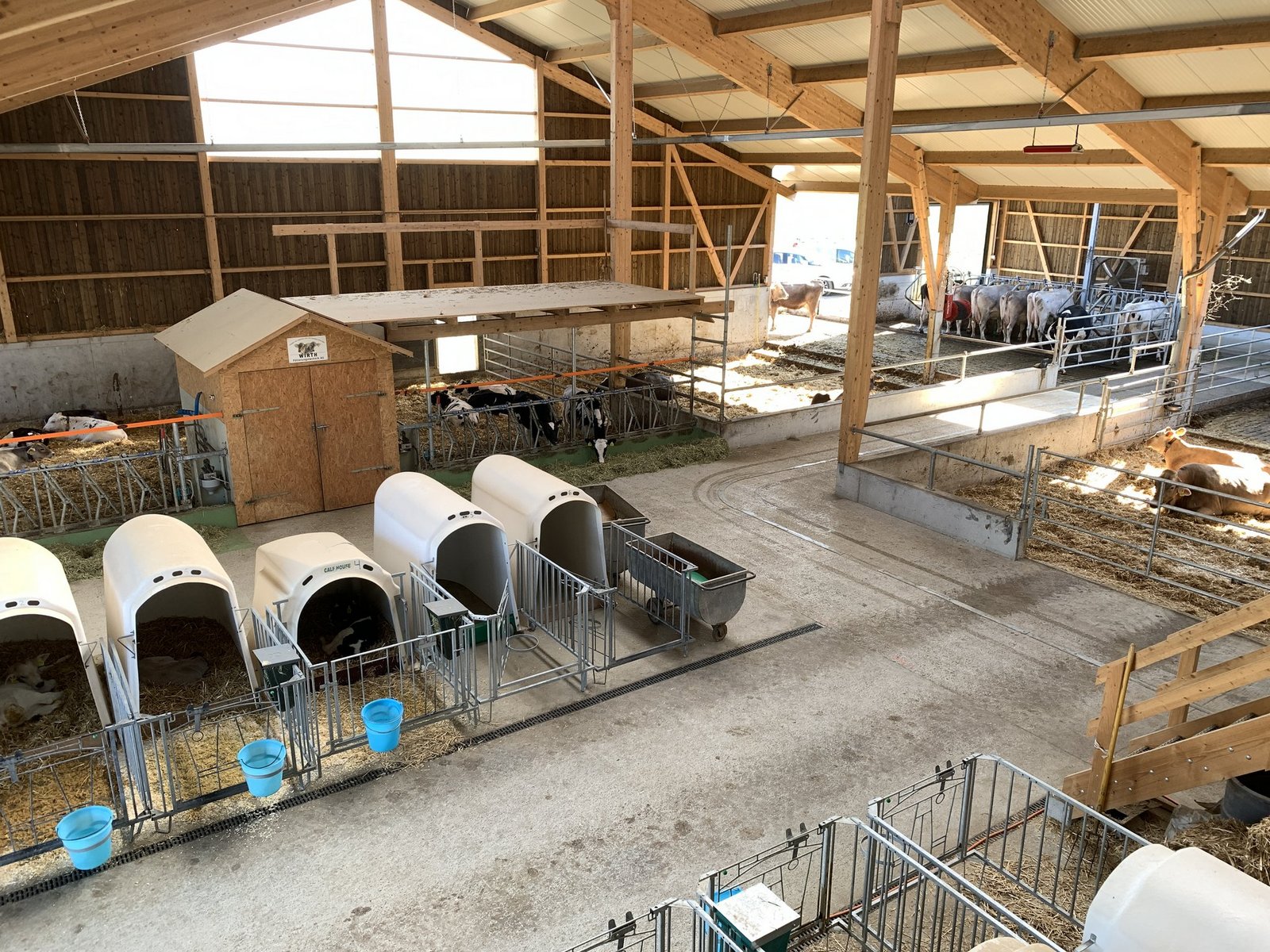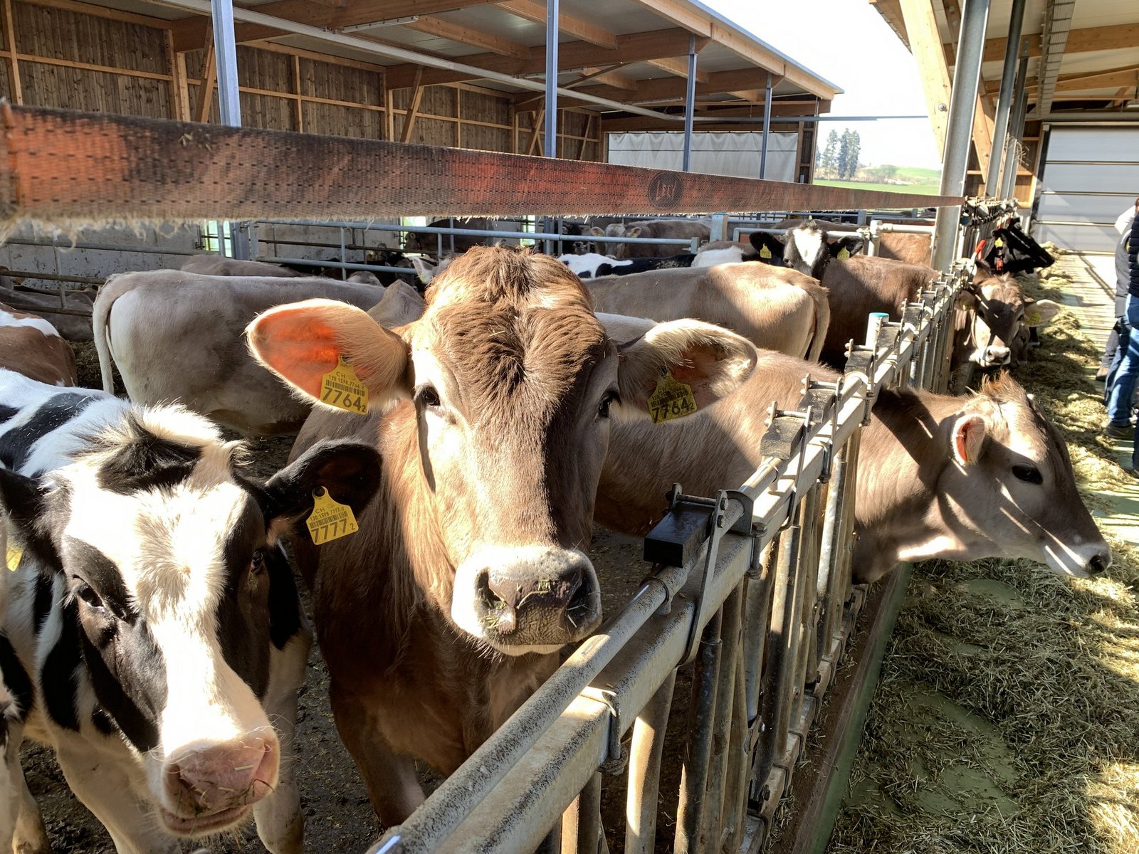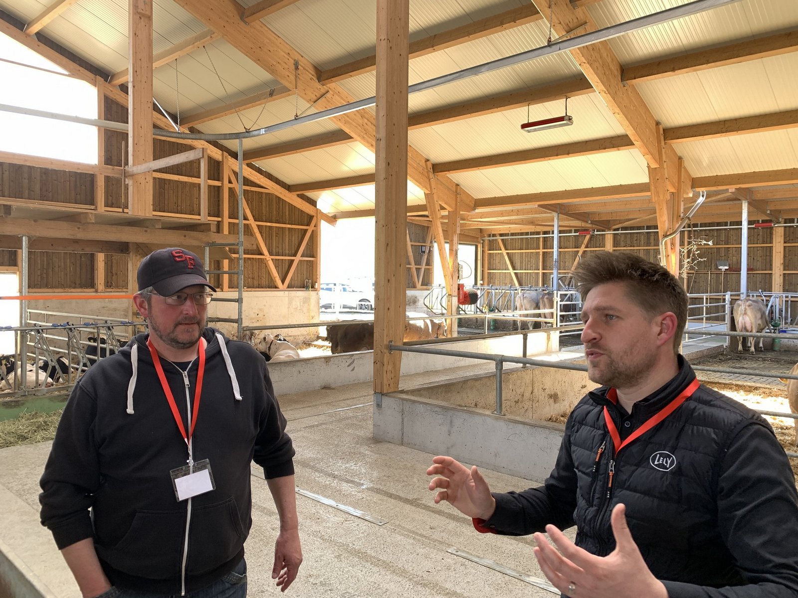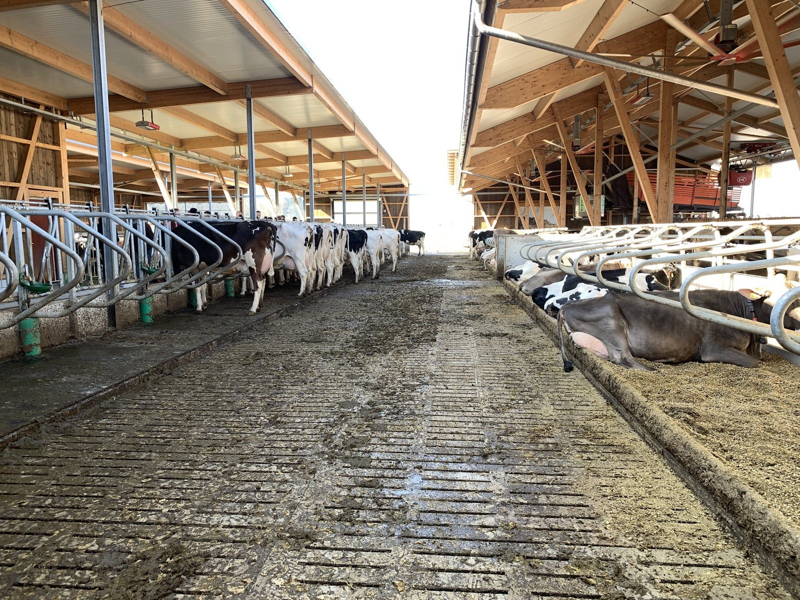 Der vor gut einem Jahr bezogene Stall bietet Platz für 80 Kuhplätze, plus das Jungvieh. Derzeit werden 65 Kühe gemolken. Dürrenmatt besamt die Rinder früher, weil sie mit dem Automaten mehr fressen seien sie schneller besamungsreif, das Erstkalbealter liegt bei 25 Monaten. Er wolle eine unkomplizierte Kuh mit 10000 Kg Leistungsschnitt. Scharfe Holsteinkühe seien stoffwechselanfällig. Er habe als Quereinsteiger – Dürrenmatt ist gelernter Hufschmid – nicht das Gen der Superzüchter. Aus dem Holsteinzuchtverband ist er ausgetreten, er habe genügend eigene Daten für ein optimales Management.