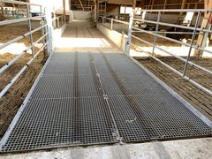 Um den Melkroboter ist der Boden gummiert und perforiert, aber nicht weich, damit Flüssiges beim Auftritt ablaufen kann und die Klauen trocken bleiben. Die Betonspalten in den Laufgängen sind mit Quarzsand belegt, für besseren Klauenabrieb. Der Melkroboter steht in Laufrichtung des Laufganges. Eingebaut wurde auch eine helle warme Beleuchtung. Nachtlicht sei hingegen unnötig und unnatürlich, findet Dürrenmatt. Trotz sehr offenem und luftigem Stall könne es im Sommer warm werden, Deckenlüfter sorgen deshalb für Kühlung und weniger Fliegen.