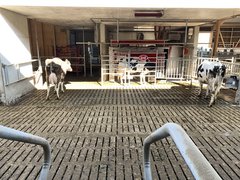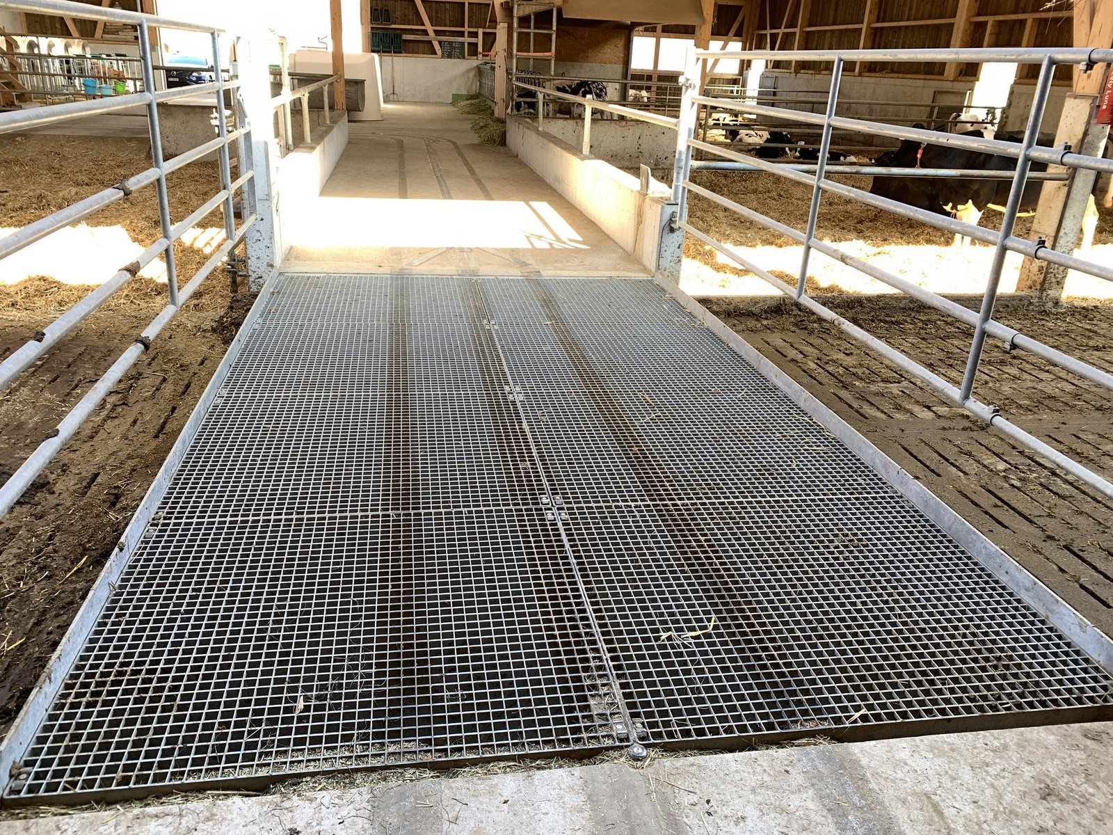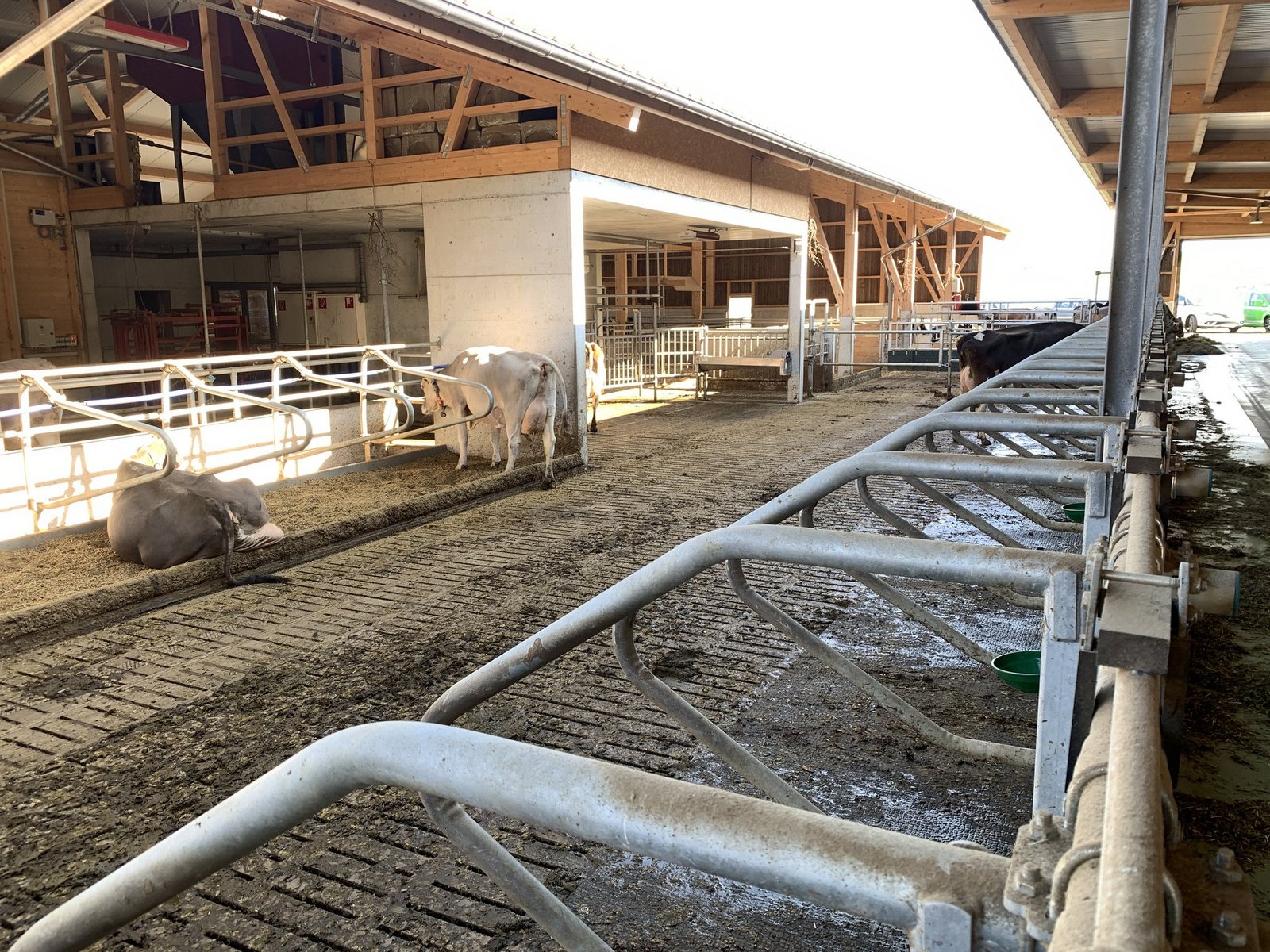 Zwischen Futtertenn und übrigem Stall mit den Fressplätzen fährt der Roboter über eine Brücke im Laufgang. Im zweireihigen Stall hat jede Kuh ihren Fressplatz, ein Fressgitter erleichtere die Arbeit, wenn Tiere fixiert werden müssten, beispielsweise für die Besamung oder Behandlung. Auch das Jungvieh und die Kälber sind im neuen Stall untergebracht und gefüttert werden diese ebenfalls automatisiert am Fressgitter. Beim Fressplatz sind zusätzlich zu den grossen Tränketrögen weitere Tränkebecken montiert, die Kühe würden so mehr saufen. Von Nackenrohren hält Dürrenmatt wenig, die Bügel bei den Liegeboxen hätten sich bewährt und reduzieren auch die Ammoniakbelastung.