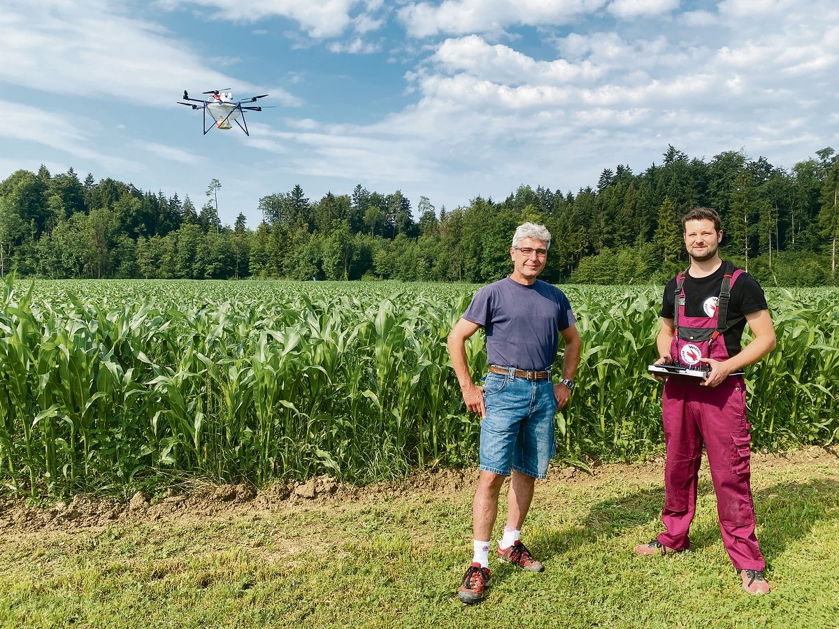 Heute lässt Thomas Widmer seine Drohne über dem Maisfeld von Matthias Schälchli fliegen. Der Landwirt setzt schon seit über 25 Jahren auf die Trichogramma-Schlupfwespen in seinem Körnermais. «Bevor wir alles auf Bio umstellten, hatten wir noch 86 Zucht- und 480 Mastschweine, die 800 bis 1000 kg Mais pro Tag frassen. Alles aus eigenem Anbau. Ausfälle konnte ich mir nicht leisten», blickt Schälchli zurück. Deshalb habe er prophylaktisch Trichogramma-Schlupfwespen ausgebracht. Anfänglich noch per Kärtchen: «Das war sehr mühsam. Beim zweiten Durchgang sind wir sogar mit Skibrillen durch die schon zwei Meter hohen Maispflanzen gegangen – damit uns das Gesicht nicht zerschnitten wird.» Das Aufhängen der Kärtchen hat zudem sehr viel Zeit in Anspruch genommen: «Für fast 30 Hektaren waren wir zu zweit sicher zwei Tage beschäftigt», die Schälchli jetzt anderen Dingen auf dem Hof widmen kann.