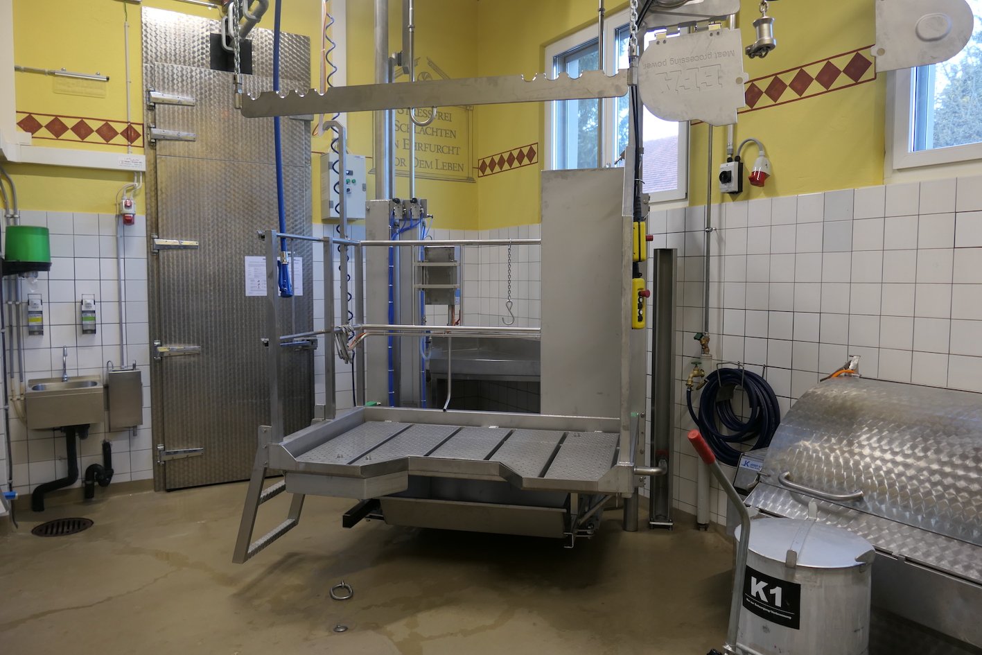Müller erwarb zudem den entsprechenden Sachkundeausweis und ist überdies im Besitz des Jagdpatents. Mit der Übernahme wagt das Paar eine Neuausrichtung. Anders als bisher, wird fortan ausschliesslich auf die Hof- oder Weideschlachtung gesetzt. Dies erforderte Anpassungen: Während die Tiere bei einem konventionellen Schlachtbetrieb die Anlage lebendig betreten, braucht es für tote Tiere eine technische Einrichtung, um sie hineinzuhieven. «Um nicht mehr von Hand kurbeln zu müssen, haben wir den Seilzug durch eine hydraulische Vorrichtung ersetzt», sagt Müller.