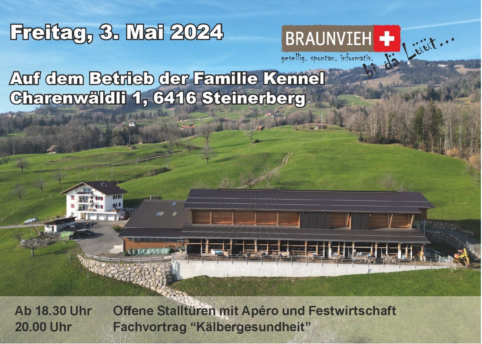 Am Freitag, 3. Mai, findet «Braunvieh bi dä Lüüt» auf dem Betrieb von Markus Kennel im Steinerberg statt. Nicht nur das schöne Braunvieh der Familie Kennel ist einen Besuch wert, auch die Besichtigung des neuen und imposanten Laufstalls macht den Anlass interessant. Ab 18.30 Uhr sind die Stalltüren für einen Apéro mit Betriebsbesichtigung geöffnet. Im Anschluss folgt das Fachreferat von Tierärztin Corinne Bähler zum Thema Kälbergesundheit.