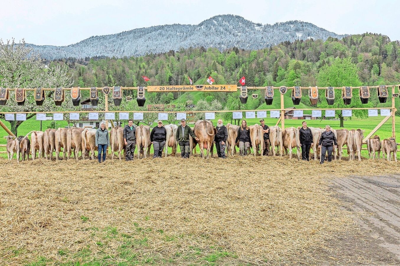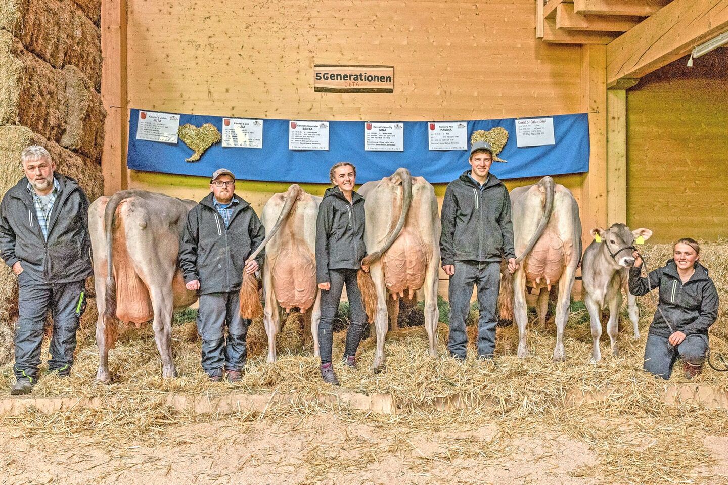 Neben den Halteprämien wurde in den letzten Wochen auch bereits eine grosse Zahl an weiblichen Braunvieh-Zuchtfamilien präsentiert. Eine eindrückliche Tiergruppe konnte dabei Familie Kennel vom Steinerberg von ihrer Stammkuh Joe Jana ausstellen. Die Zuchtfamilie erreichte hohe 90 Punkte. Zudem konnten Kennels noch eine zweite Zuchtfamilie und die 100 000er-Kuh Juta präsentieren. Der Zuchtviehbestand von Markus Kennel kann am Anlass «Braunvieh bi dä Lüüt» besichtigt werden.