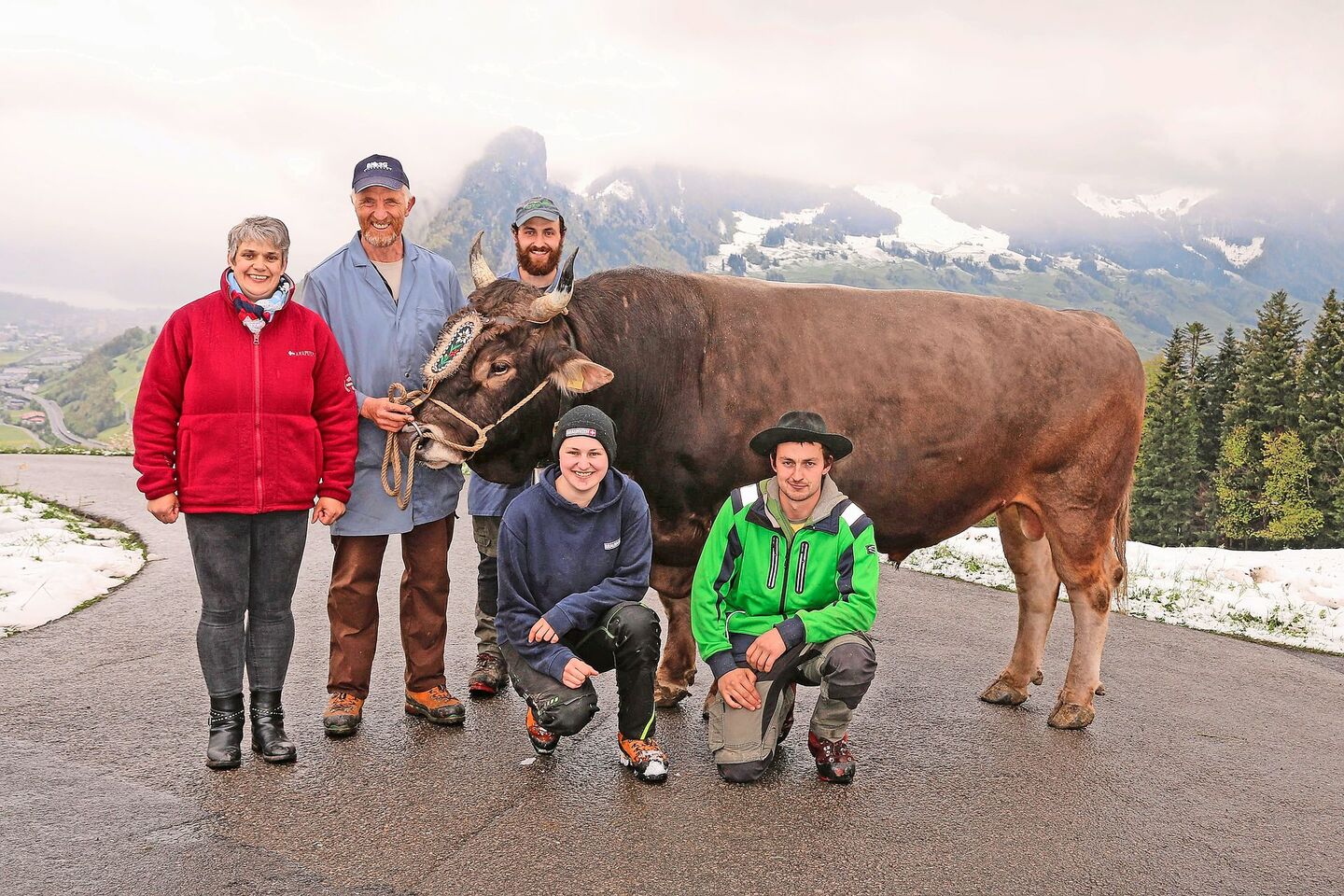 Doris und Martin Schelbert präsentierten auf ihrem Heimet im Muotathal 14 weibliche und sieben männliche Nachkommen des imposanten Stierenmarkt-Abteilungssiegers Ursin. Aufgeführt wurden 24 Tiere, darunter sieben Jungstiere und ein gekalbtes Rind. Mit einem Gesamtzuchtwert von 1040 Punkten erreichte die Gruppe bei den inneren Werten 14 Punkte. Im Exterieur gab es 30, in der Bemuskelung vier und Gesamteindruck drei Zähler. Total kam die Halteprämie Lorenz Ursin auf 51 Punkte.