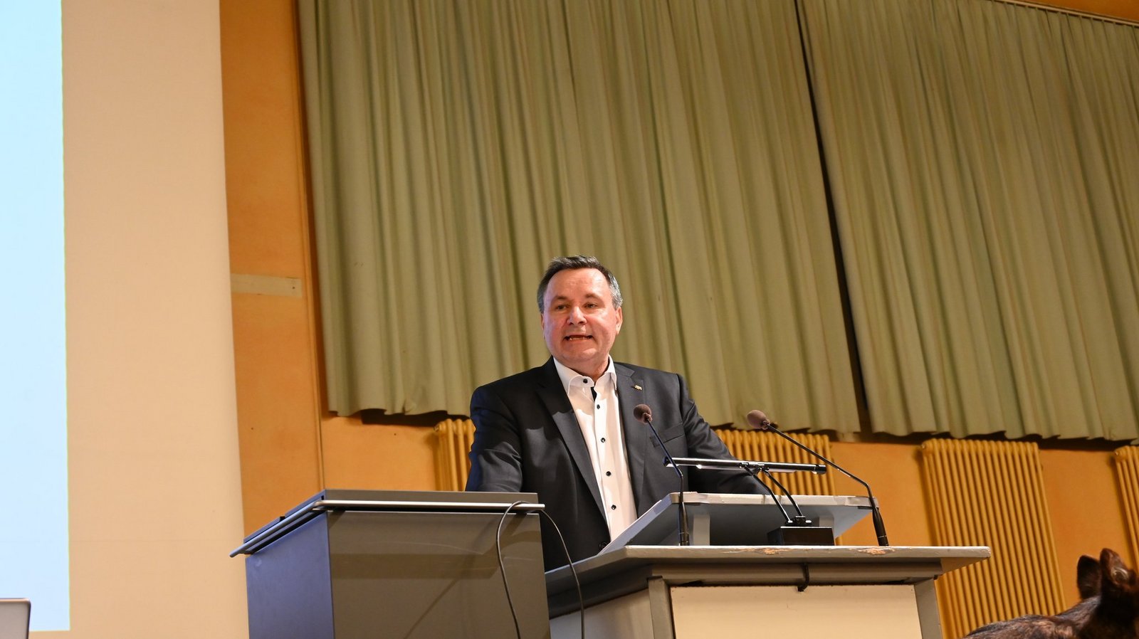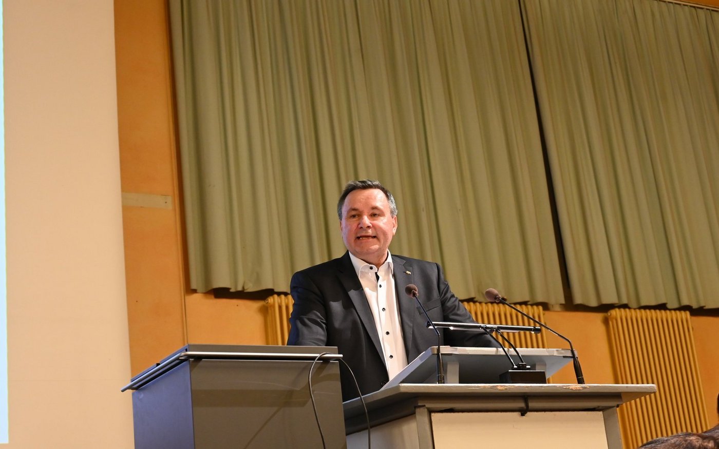 Im Anschluss sprach Ständerat Werner Salzmann zum Thema: Welche Zukunft hat die Landwirtschaft? Nach einem geschichtlichen Exkurs zur Agrarpolitik in der Schweiz erörterte er die Mengen der gesetzlichen Pflichtlager. Der 100-prozentige Füllgrad beim Düngerpflichtlager etwa reiche gerade für einen Drittel einer Vegetationsphase, bemängelte er. Der Selbstversorsorgungsgrad könne aber nicht gesteigert werden, wenn die Politik den Wolf bei der landwirtschaftlichen Produktion vor die Nutztiere stelle. Die Unabhängigkeit gewinne immer mehr an Bedeutung. Die inländische Nahrungsmittelproduktion müsse gesichert werden. Schlussendlich zieht der Ständerat das Fazit, dass die Schweizer Landwirtschaft Zukunft hat. Denn gegessen werde immer. [IMG 2]