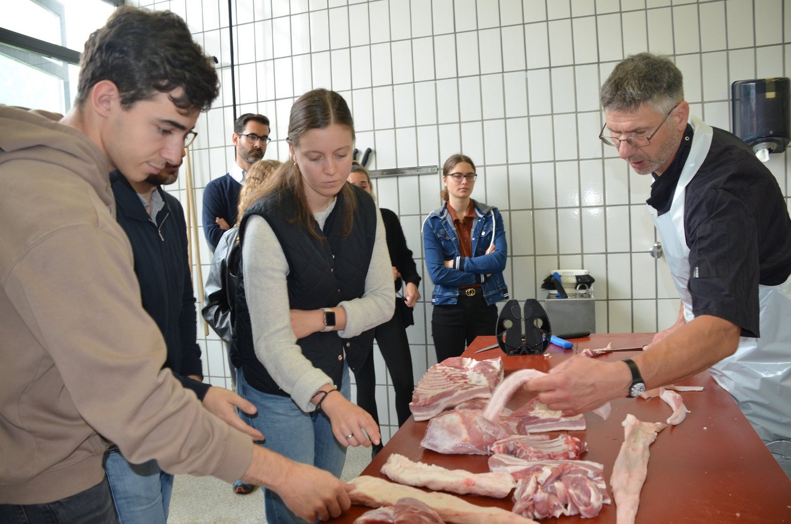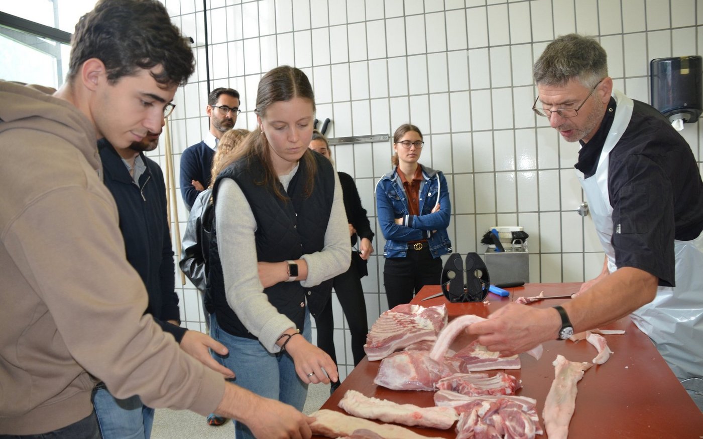 In der Schulschlachtanlage wurden nicht pfannenfertig zerlegte Fleischstücke vorgelegt. Die Fleischfachmänner schlachteten zuerst ein Schwein, bevor sie beim Ausbeinen und Zerlegen erklärten, wie die einzelnen Teile des Tieres in der Küche am besten verarbeitet werden.