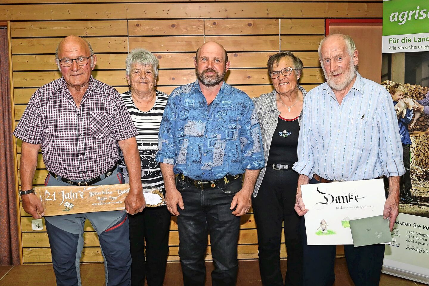 Neben einer schönen Zahl an Urner EFZ- und BLS1-Absolventen wurden in der Dienstboten-Ehrung auch langjährige landwirtschaftliche Mitarbeiterinnen und Mitarbeiter gewürdigt. So zeichneten Urs Arnold und Hermann Wipfli vom Korporationsbürgerrat Seelisberg die Älplerin Agatha Landolt und den Älpler Franz Baggenstos für ihren langjährigen Dienst auf der Alp Matten aus. Landwirt Heinz Arnold ehrte Xaver Bissig für seinen jahrelangen Einsatz auf dem Heimbetrieb Fritter in Unterschächen und Agatha und Josef Arnold-Arnold für ihre grossen Leistungen auf der Alp Urnerboden.