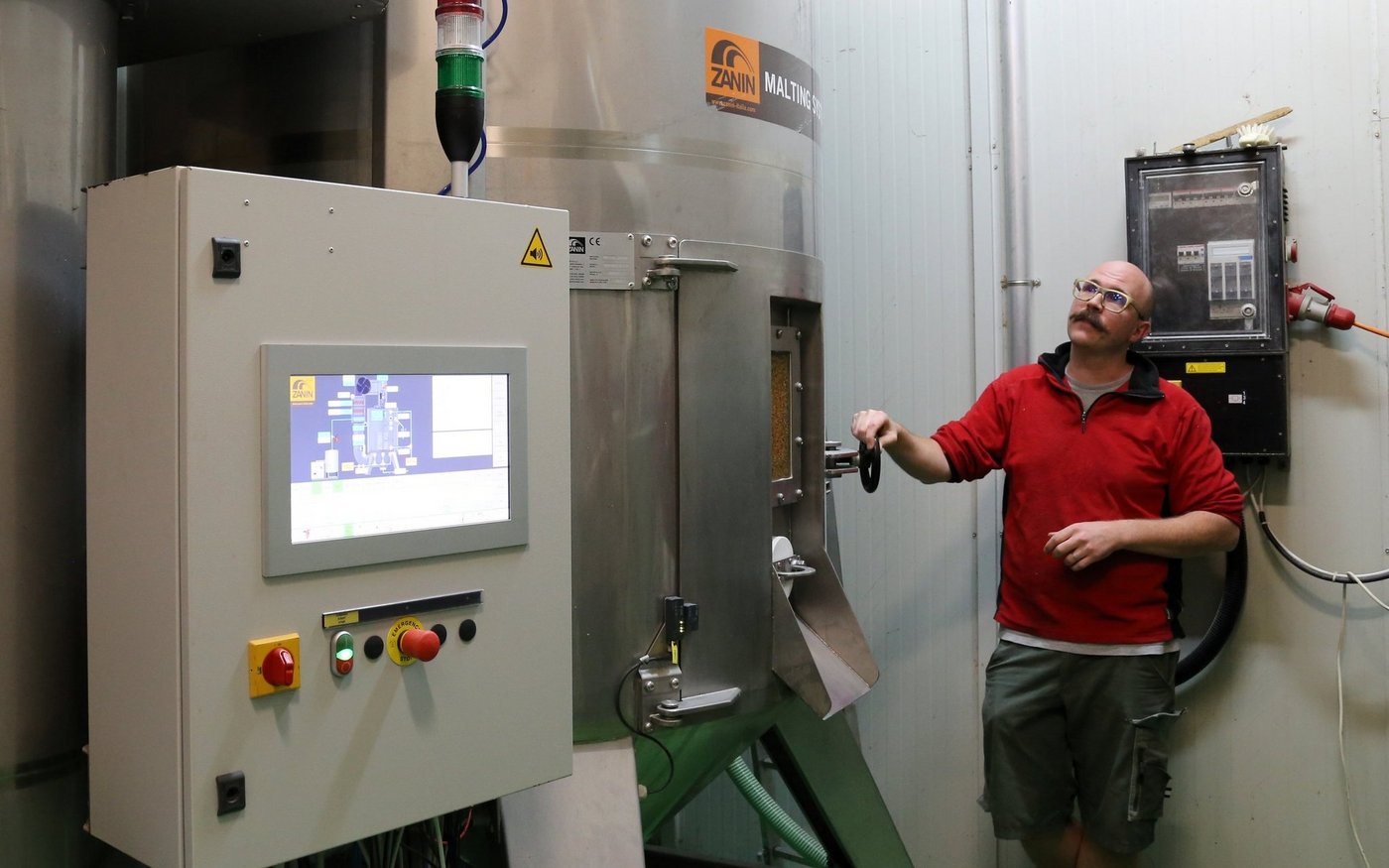 Die Gerste, Hirse oder Weizen stammen direkt von den Feldern von Adrian Feitknecht und durchlaufen eine sorgfältige Reinigung und Klassifizierung. Sobald die Trennung zwischen Futter- und Braugetreide erfolgt ist, beginnt der Mälzungsprozess. Das Getreide, das anfangs etwa 12 Prozent Feuchtigkeit aufweist, wird eingeweicht, bis es etwa 48 bis 49 Prozent Feuchtigkeit hat und zu keimen beginnt. Der Keimprozess wird dabei mit der Zufuhr von kalter Luft kontrolliert und schliesslich mit einer Heisslufttrocknung unterbrochen. «Beim Mälzen holen wir die besten Eigenschaften fürs Brauen aus dem Korn heraus», erklärt Manuel Bolliger.